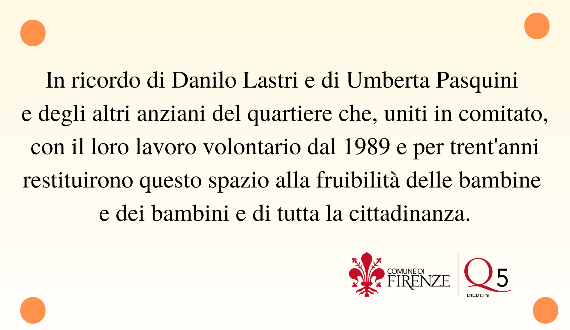 Era il 1989 quando un gruppo di persone, tra cui Danilo Lastri ex Consigliere dell’allora Quartiere 11 e sua moglie Umberta Pasquini, decisero di prendersi cura di un bellissimo terreno di proprietà comunale abbandonato da anni.