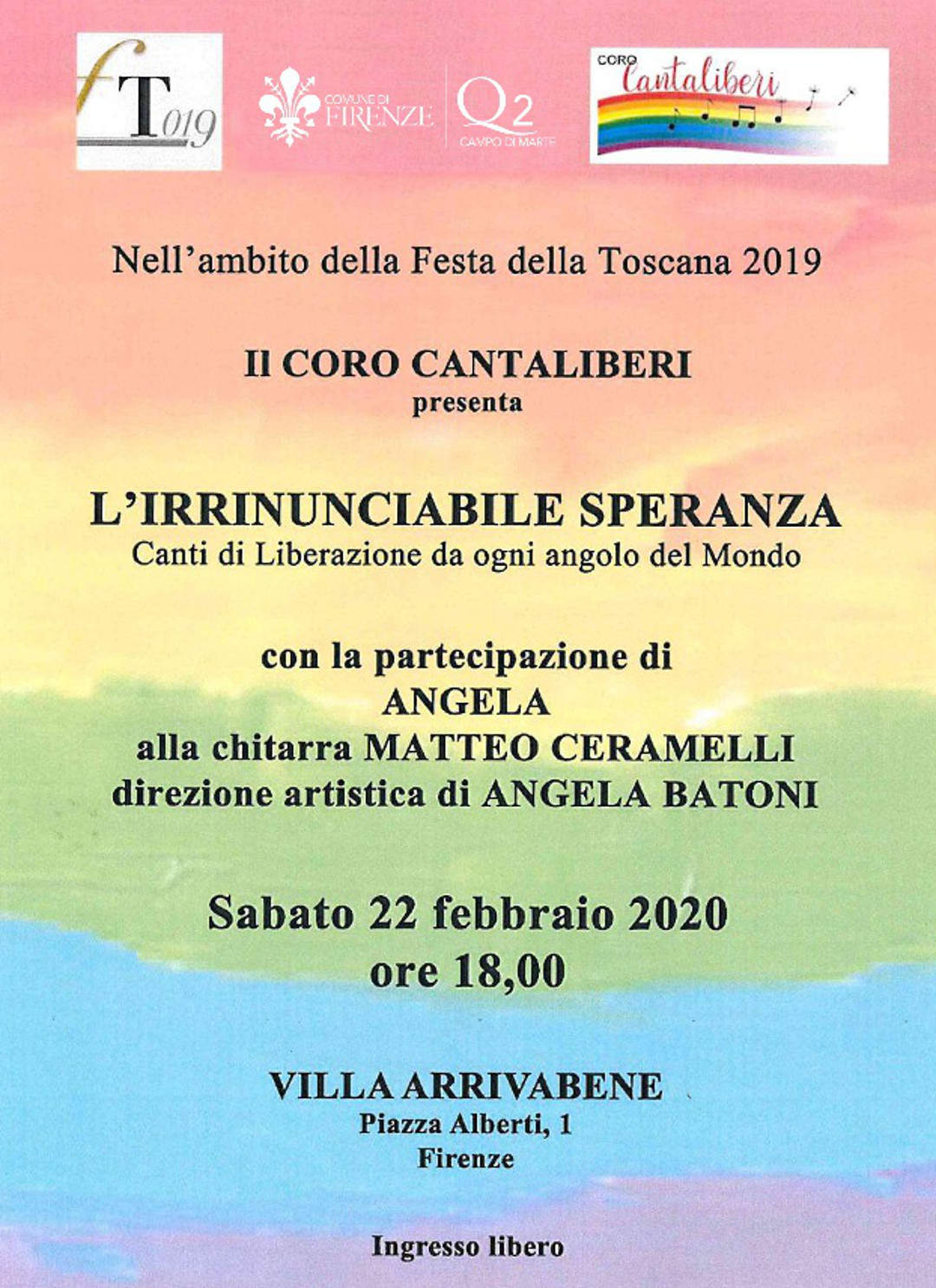 Sabato 22 febbraio alle 18, nell'ambito della Festa della Toscana 2019 si esibiranno a villa Arrivabene proponendo una selezione di canti di liberazione da ogni angolo del mondo.