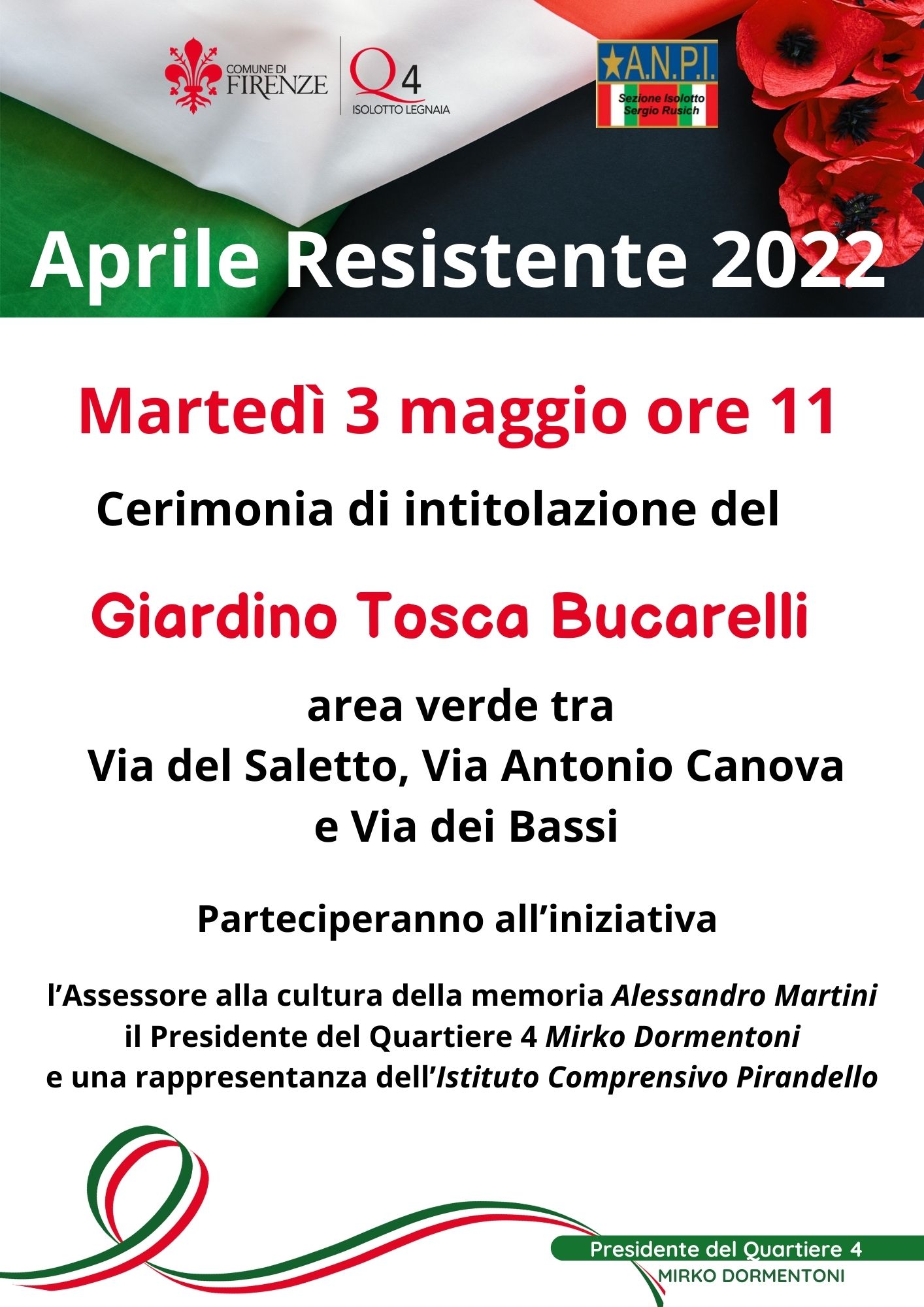 Parteciperanno all’iniziativa l’Assessore alla cultura della memoria Alessandro Martini, il Presidente del Quartiere 4 Mirko Dormentoni e una rappresentanza dell’Istituto Comprensivo Pirandello.