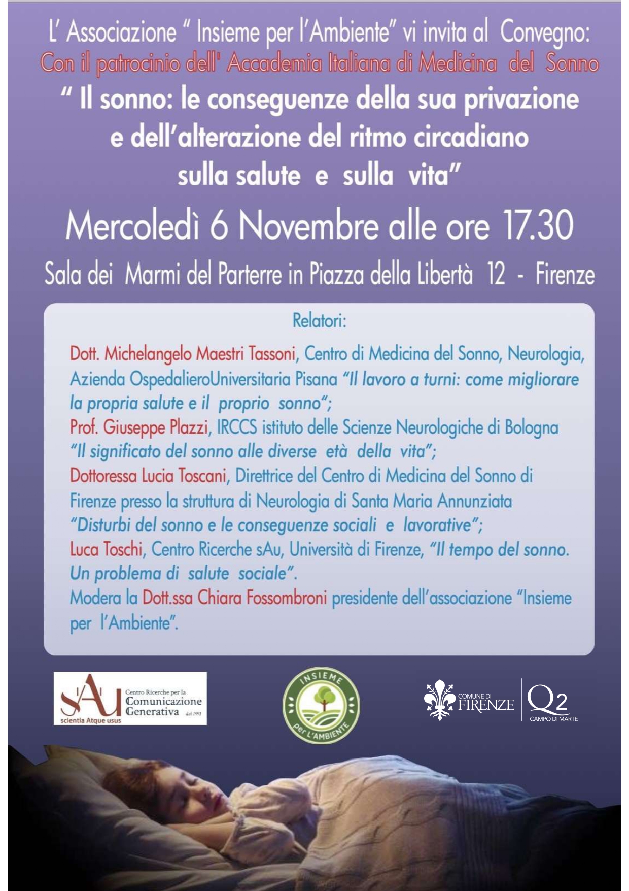 Mercoledì 6 Novembre alle ore 17.30, nella Sala dei Marmi al Parterre, si terrà il convegno "Il sonno: le conseguenze della sia privazione e dell'alterazione del ritmo circadiano sulla salute e sulla vita", organizzato dall'Associazione Insieme per l'Ambiente con il patrocinio dell'Accademia italiana di Medicina del Sonno e la collaborazione del Quartiere 2.