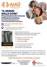"Cinque generazioni di donne che attraverso diverse epoche affrontano la vita, cercando di superare i dolori del passato": il romanzo "Il segno delle cose" di Elisabetta Mottino, psicologa psicoterapeuta, referente AIAU ODV sede Udine, parla del trauma e soprattutto del fatto che "ognuno di noi è parte di una storia, ma non è una storia già scritta". L'evento, patrocinato dal Comune di Firenze, con la collaborazione del Quartiere 1, si terrà il giorno 8 settembre alle ore 17.30 presso Caffè Letterario Le Murate. Si continuerà a parlare del tema anche a cena. Per informazioni e pronotazioni: progetti@aiau.it