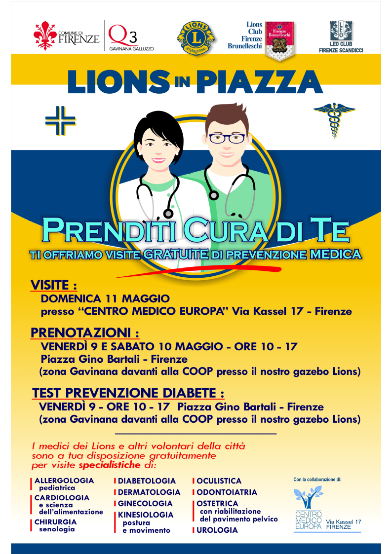 Nei giorni di venerdì 9, sabato 10 e domenica 11 maggio i medici dei Lions ed altri volontari saranno a disposizione della cittadinanza gratuitamente per delle visite mediche specialistiche di vario tipo.