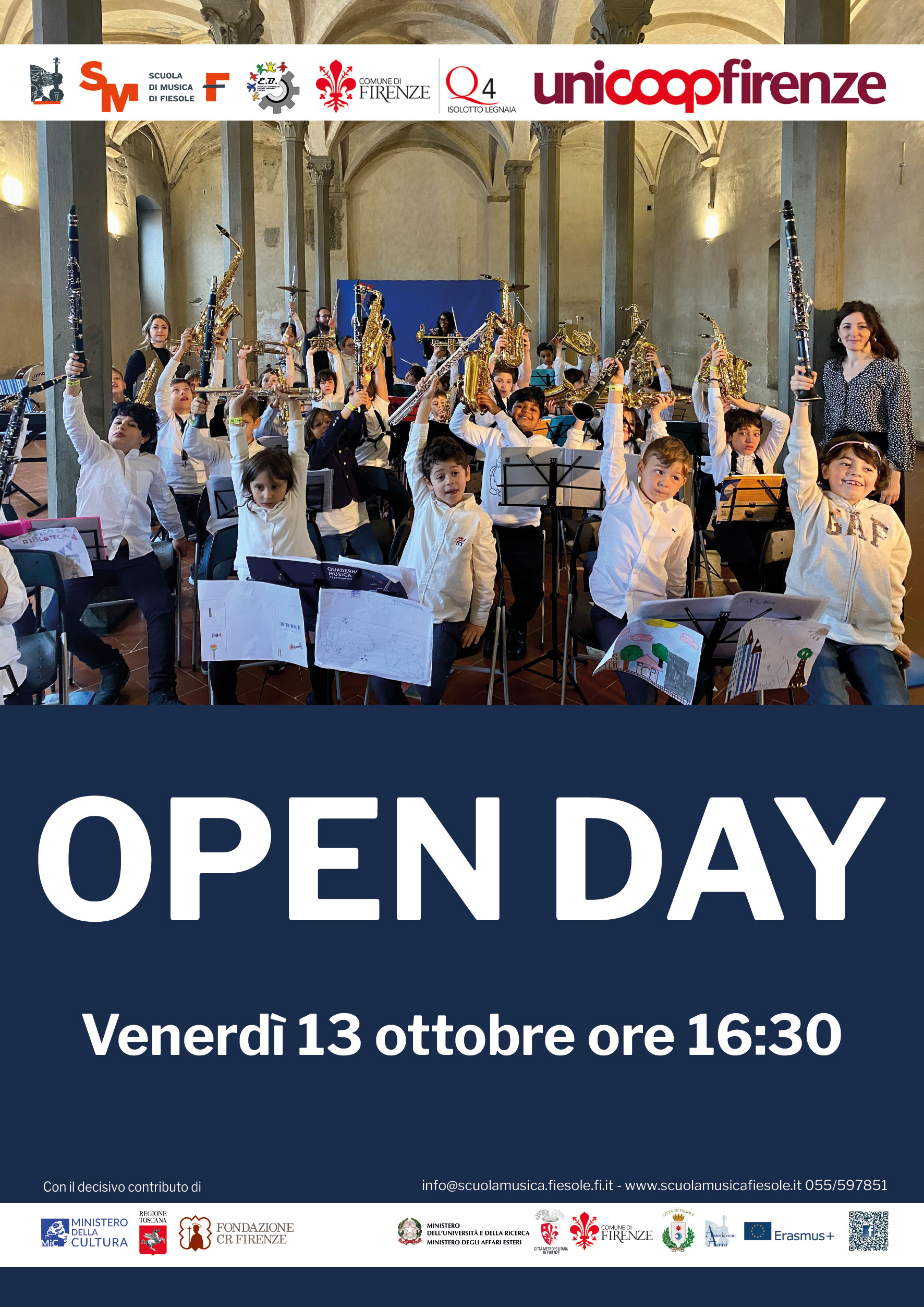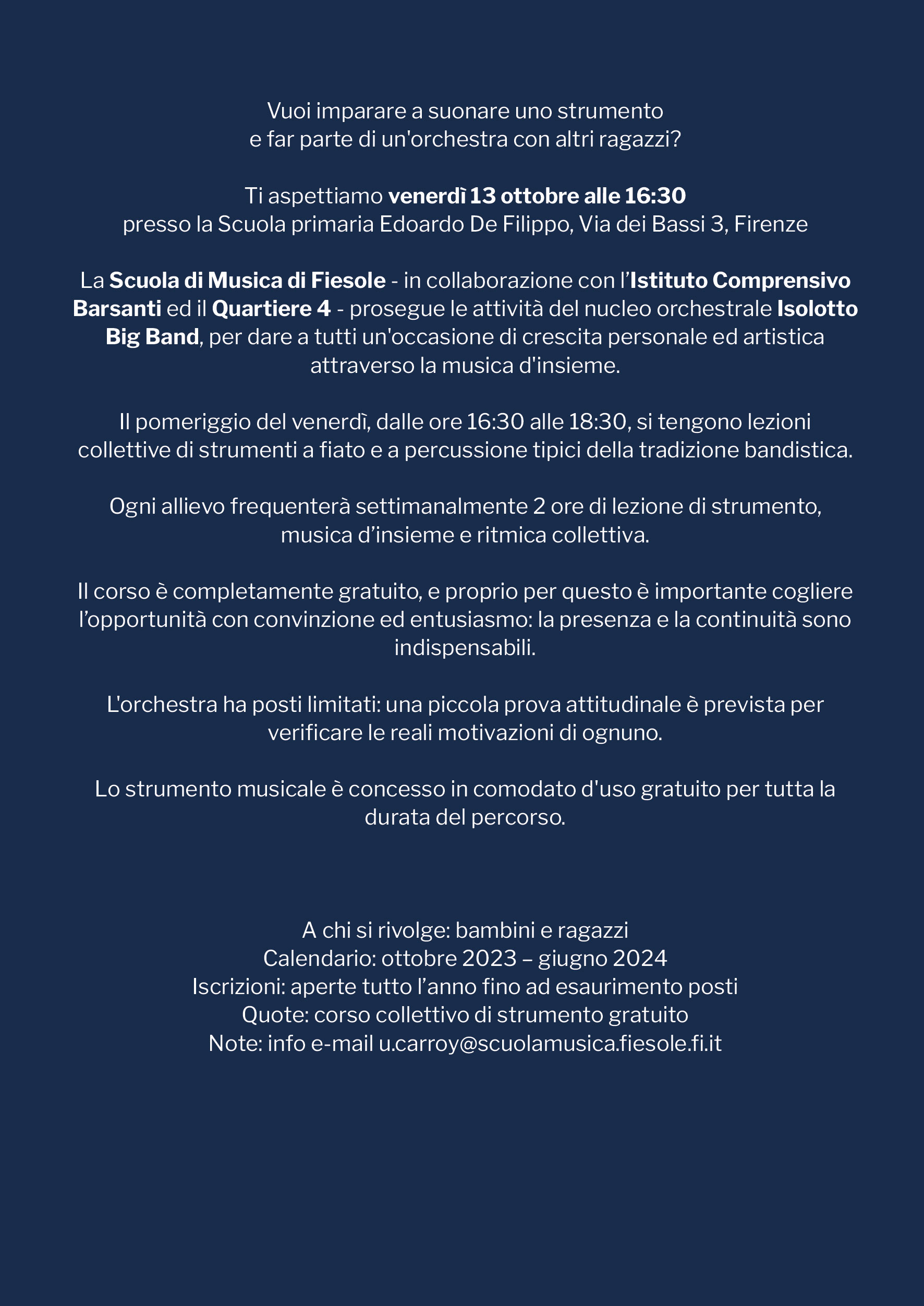 A chi si rivolge: bambini e ragazzi. Calendario: ottobre 2023 – giugno 2024. Iscrizioni: aperte tutto l’anno fino ad esaurimento posti. Quote: corso collettivo di strumento gratuito. Info: u.carroy@scuolamusica.fiesole.fi.it.