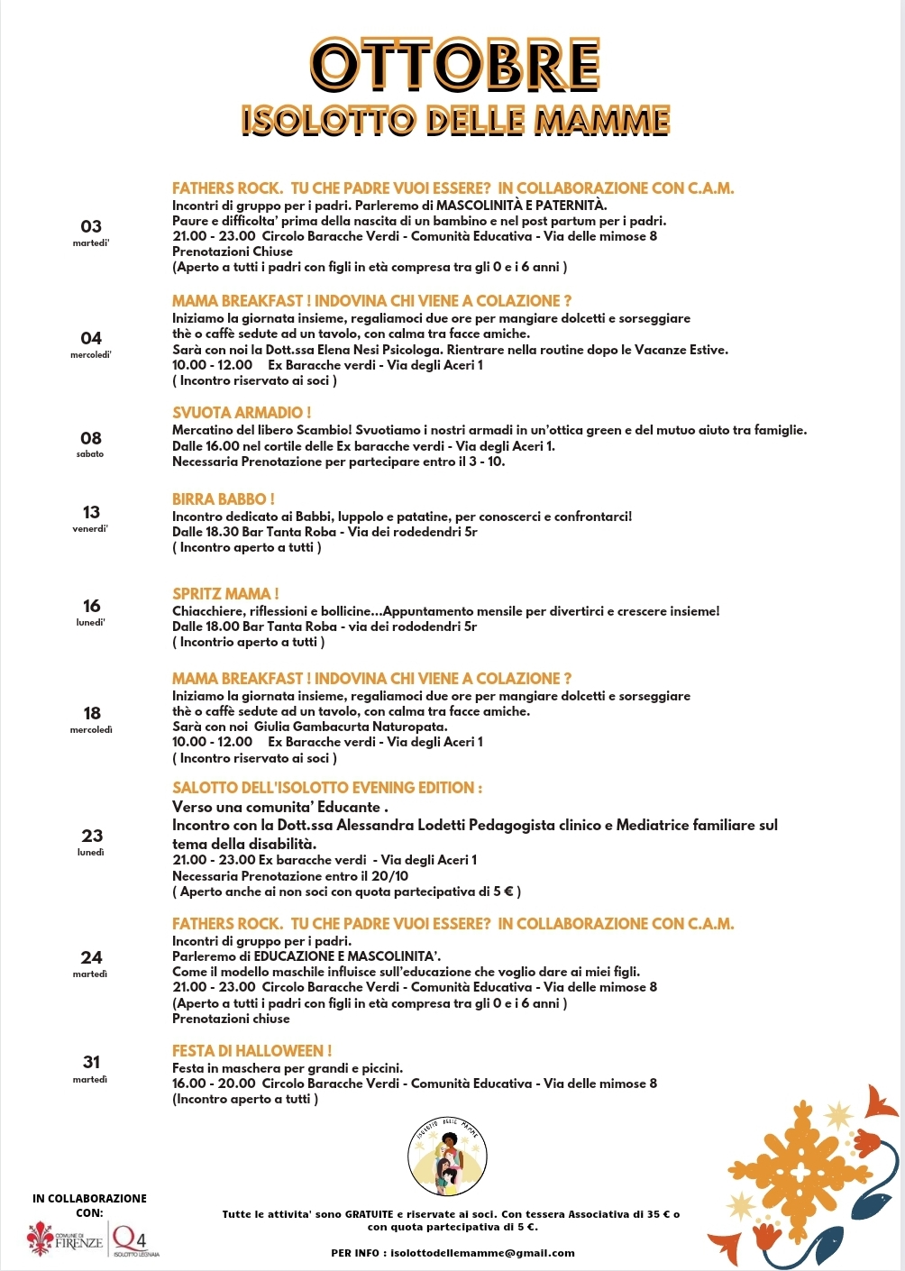 L’associazione Isolotto delle Mamme, che ha la collaborazione del Quartiere 4, presenta il programma delle prossime iniziative: