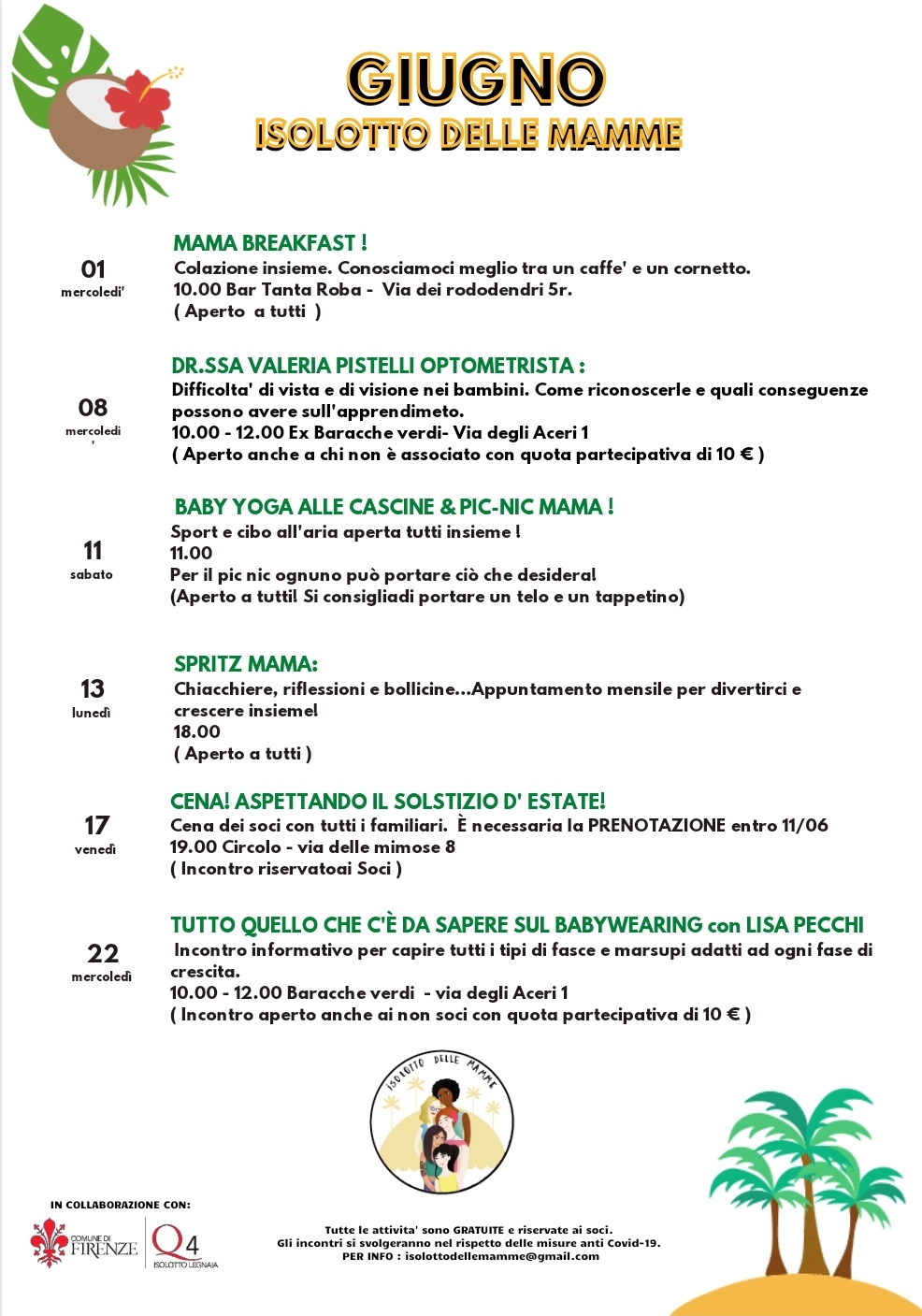 Il programma di giugno dell’associazione Isolotto delle Mamme, che organizza incontri informativi e di supporto alla persona e alla genitorialità e attività ricreative per famiglie, in collaborazione con il Quartiere 4