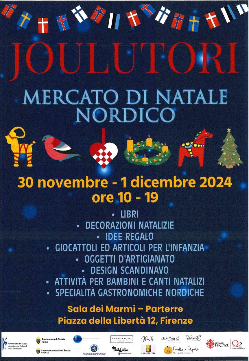 Torna anche nel 2024 il mercato di natale nordico Joulutori, sabato 30 novembre e domenica 1 dicembre dalle ore 10.00 alle ore 19.00 alla Sala dei Marmi al Parterre in Piazza della Libertà; come per la scorsa edizione, l'evento proporrà articoli vintage, libri, oggetti d'artigianato e molto altro ancora.