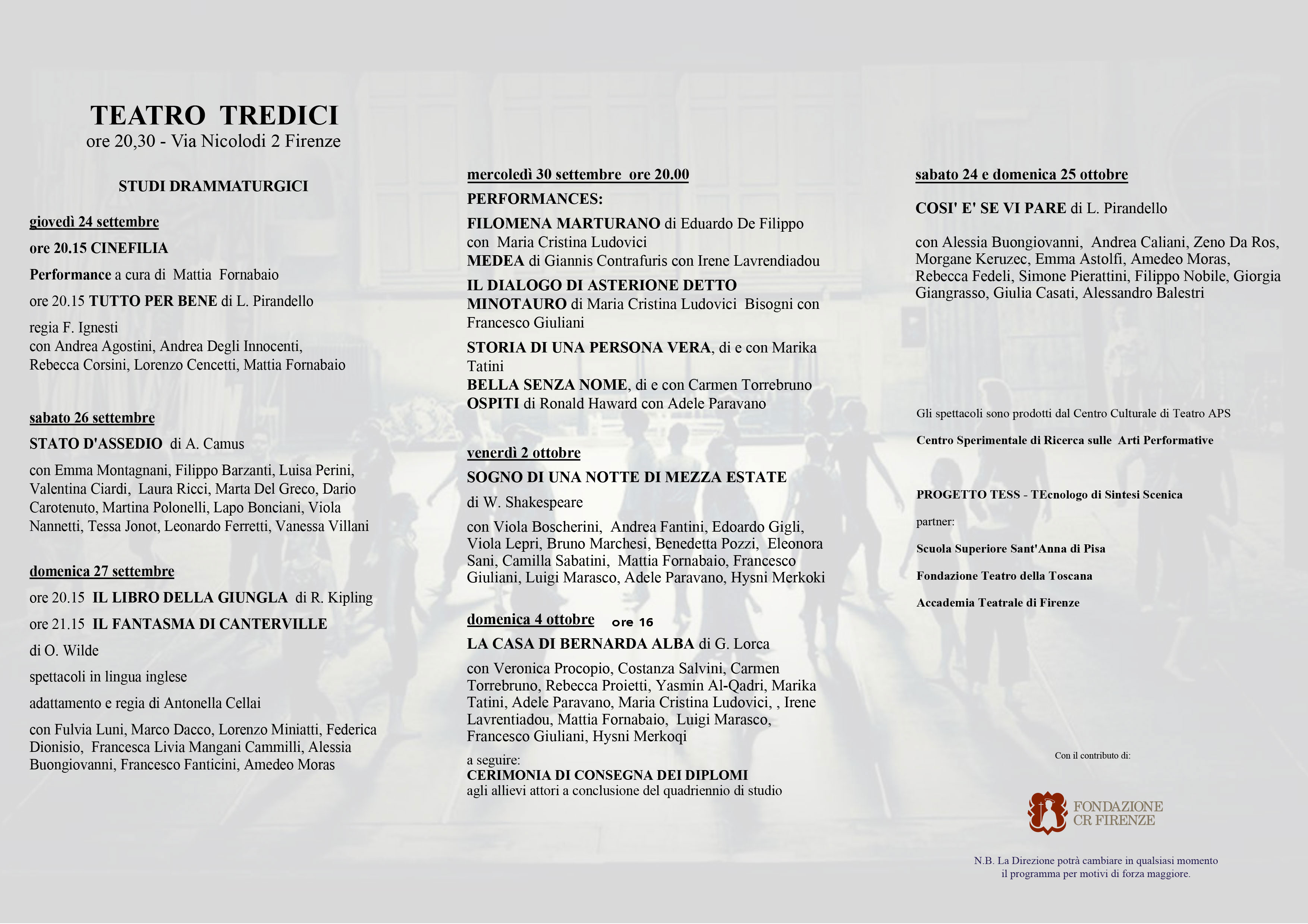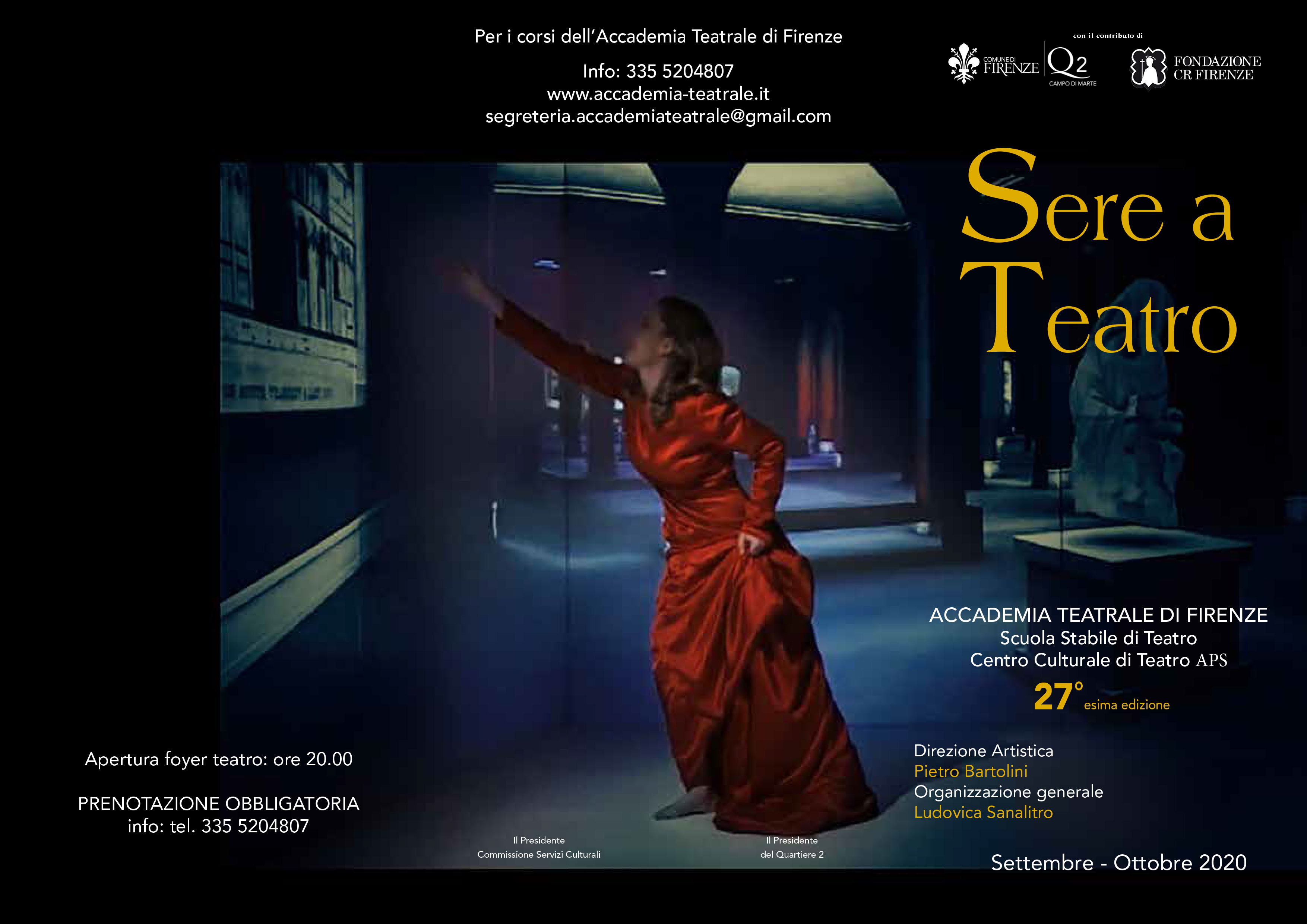 Al Teatro Tredici di Firenze, in via Nicolodi, 2, dal 24 settembre al 25 ottobre va in scena la ventisettesima edizione della rassegna teatrale Sere a teatro una serie di spettacoli e studi drammaturgici con protagonisti oltre ottanta giovani allievi attori diretti dal regista fiorentino Pietro Bartolini con l'organizzazione di Ludovica Sanalitro. Il teatro del Quartiere 2, chiuso per la pandemia in primavera, riapre finalmente le sue porte al pubblico. Un viaggio immaginario con i grandi autori della drammaturgia internazionale e della letteratura italiana: da Pirandello (Tutto per bene e Così è se vi pare), Camus (Stato d'Assedio), Shakespeare (Sogno di una notte di mezza estate), Garcia Lorca (la Casa di Bernarda Alba), a Oscar Wilde e Kipling. I giovani attori che si sono preparati nei mesi scorsi anche seguendo lezioni online e hanno finalmente l'occasione di ritrovarsi in presenza e mettere a frutto il lavoro di preparazione svolto in questo periodo di lezioni teatrali, trainings con seminari specifici tenuti anche da docenti di livello internazionale, della Royal Academy of Dramatic Art di Londra diretta da Kenneth Branagh, del Conservatoire royal de Bruxelles e della Scuola Superiore Sant'Anna di Pisa, con il professore Massimo Bergamasco, uno dei maggiori esperti a livello mondiale di robotica avanzata e innovazione tecnologica per l’impresa in ottica Industry 4.0, con cui l'Accademia ha una collaborazione specifica per un progetto di ricerca sullo studio del rapporto tra le nuove tecnologie di “Realtà Virtuale” e le arti performative. Masters specifici vengono organizzati per preparare le nuove generazioni di attori e di registi alle performances del futuro ad alta tecnologia; seminari di recitazione in lingua inglese a cura di Antonella Cellai sono stati propedeutici alla realizzazione del Fantasma di Canterville di Oscar Wilde, spettacolo in lingua inglese; una serata sarà dedicata alla drammaturgia contemporanea con monologhi scritti dai giovani interpreti. La rassegna che si svolge ogni anno è organizzata dal Centro Culturale di Teatro è sostenuta dal Comune di Firenze, dal Quartiere 2 e dalla Fondazione Cassa di Risparmio di Firenze.