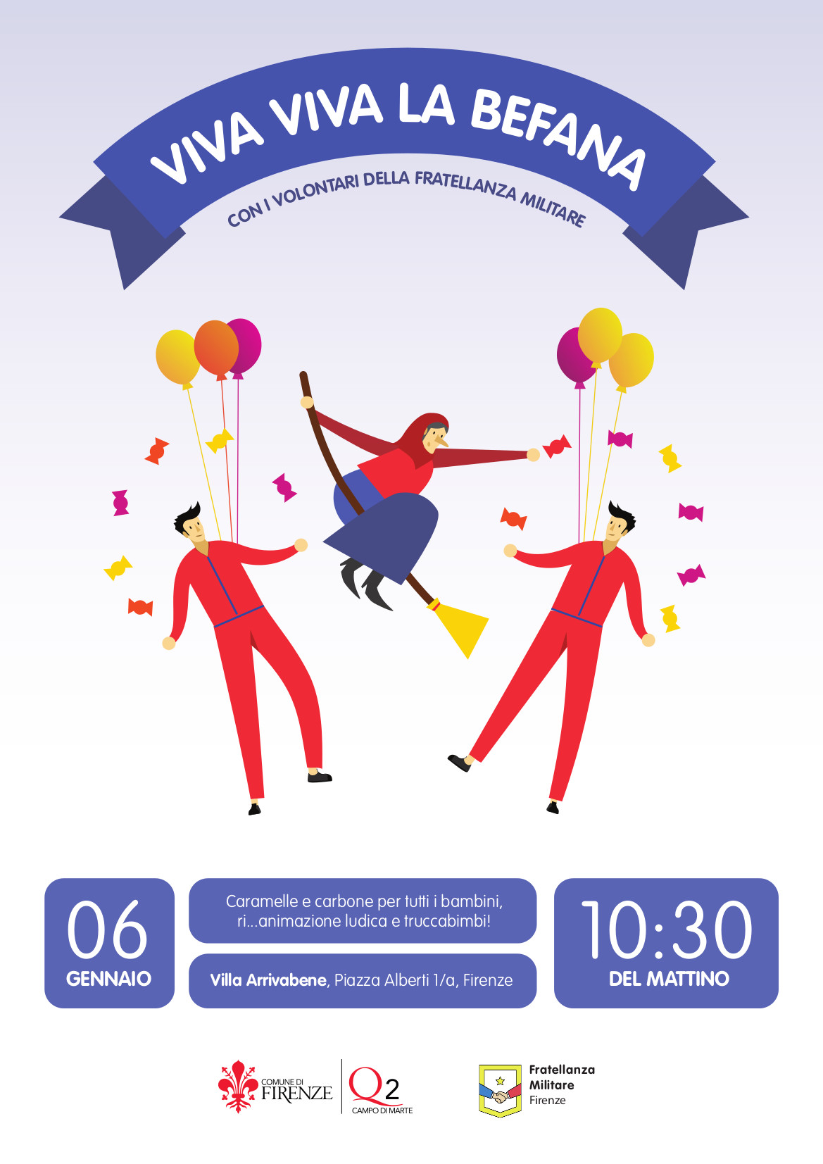 Arriva la Befana a Villa Arrivabene! Lunedì 6 gennaio alle 10.30 nel parco della sede del Quartiere 2 in piazza Alberti 1/a, la Befana porterà caramelle e carbone per tutti i bambini. All'evento sarà presente la Fratellanza militare con operatori della protezione civile ed operatori sanitari. Un'iniziativa ludica con attività d'animazione e truccabimbi, ma che vuole essere anche un'occasione per introdurre, con leggerezza, ragazzi e bambini al sistema di soccorso sia di protezione civile che sanitario.