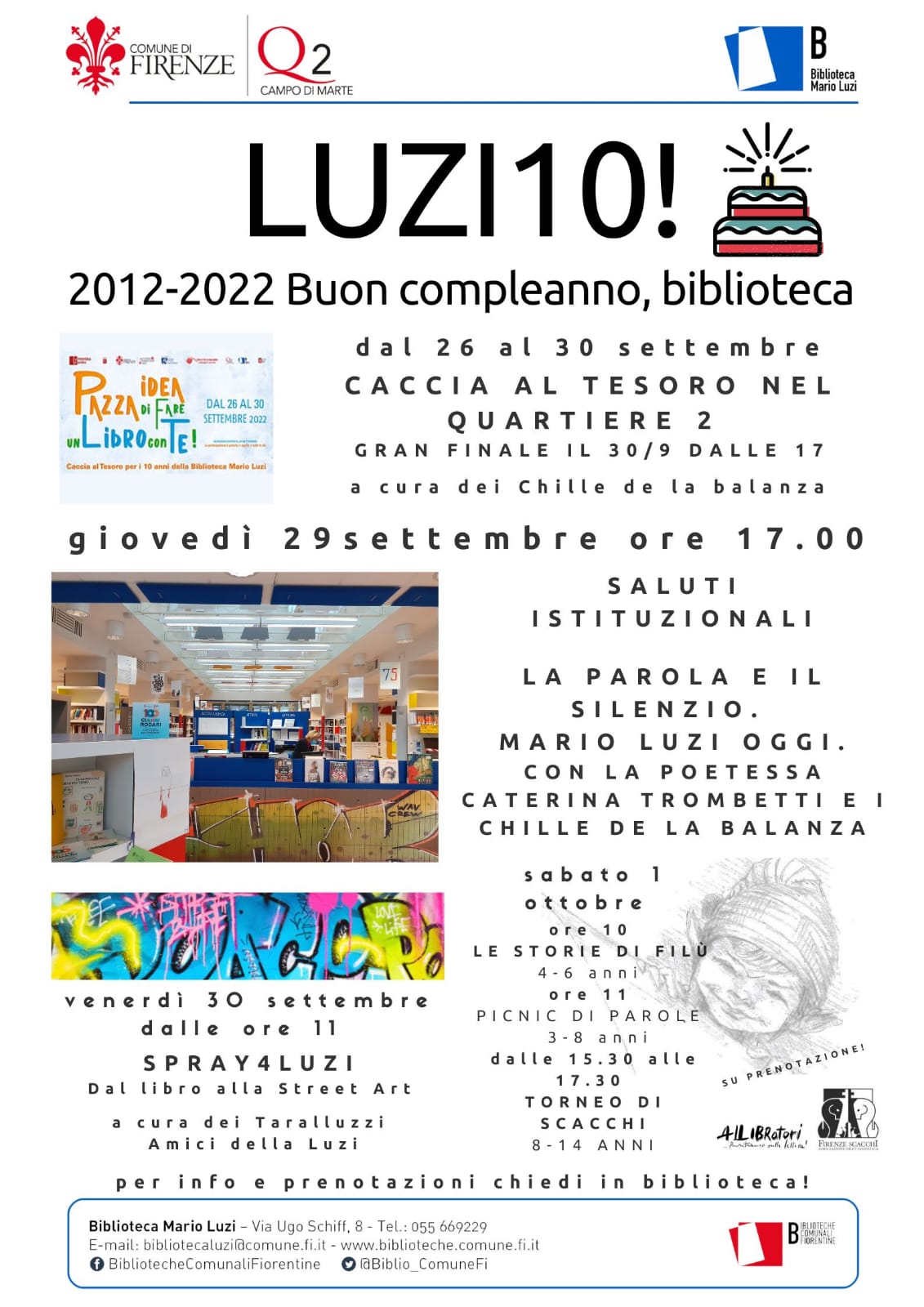 Dal 26 Settembre partono i festeggiamenti per il decennale della Biblioteca Luzi, inaugurata nel 2012 e diventata negli anni punto di riferimento di studenti e abitanti del quartiere, con in programma numerose iniziative per adulti e bambini; per tutte le attività dedicate ai bambini e ai ragazzi di sabato 1 ottobre è necessaria la prenotazione telefonando allo 055669229, recandosi direttamente in biblioteca o scrivendo a bibliotecaluzi@comune.fi.it.