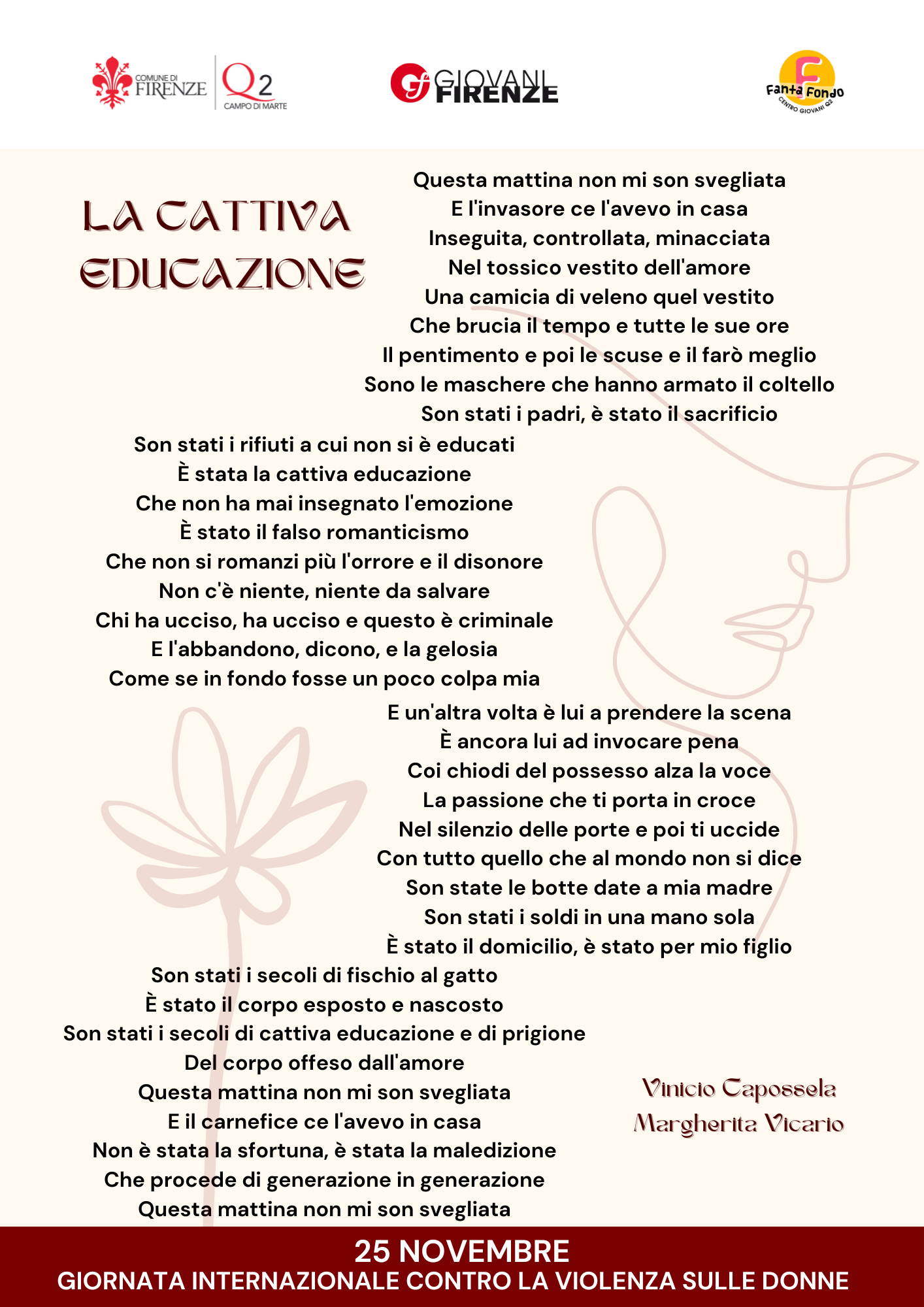 Lunedì 25 Novembre alle ore 17.00, in Piazzetta Bongo in Via di Rocca Tedalda, si terrà l'inaugurazione di una nuova installazione realizzata dai ragazzi dei Fantafondo in occasione della giornata internazionale contro la violenza sulle donne, con il contributo musicale di Sara Rados e Sergio Zanforlin di Firenze Suona che canteranno la canzone "La Cattiva Educazione" di Vinicio Capossela e Margherita Vicario.