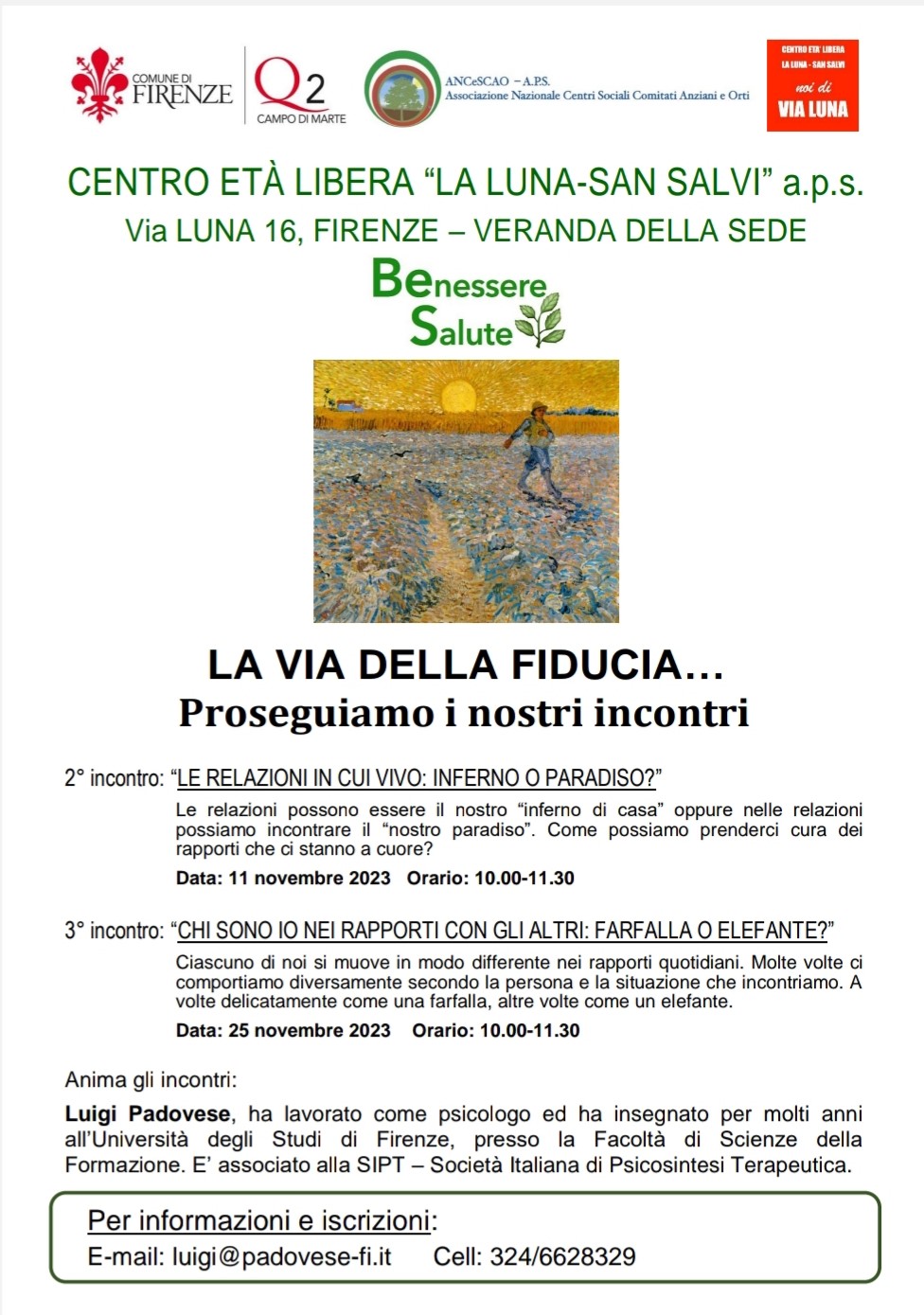 Proseguono gli incontri al Centro Età Libera "La luna - San Salvi" l'11 e il 25 novembre dalle ore 10:00 alle 11:30. Saranno affrontati due temi importanti, quali il modo di approcciarsi alle relazioni e i rapporti che si instaurano quotidianamente.