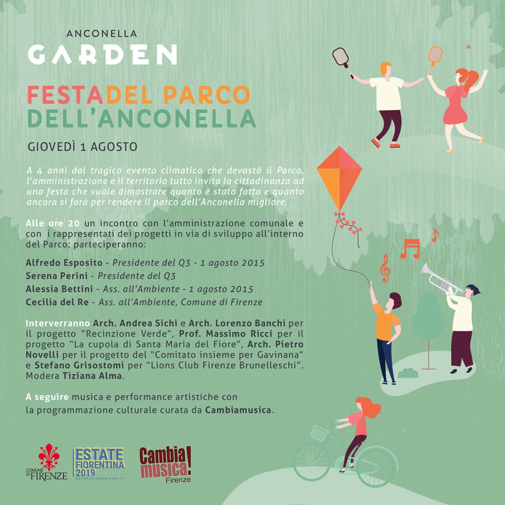 La serata inizierà alle 20, con un incontro con l’amministrazione comunale passata e attuale; verranno spiegati i progetti e le iniziative che coinvolgono il Parco dell’Anconella e seguiranno, fino alle ore 24, l'Aspettacoli e artisti, con musica e performance curate da Cambiamusica.