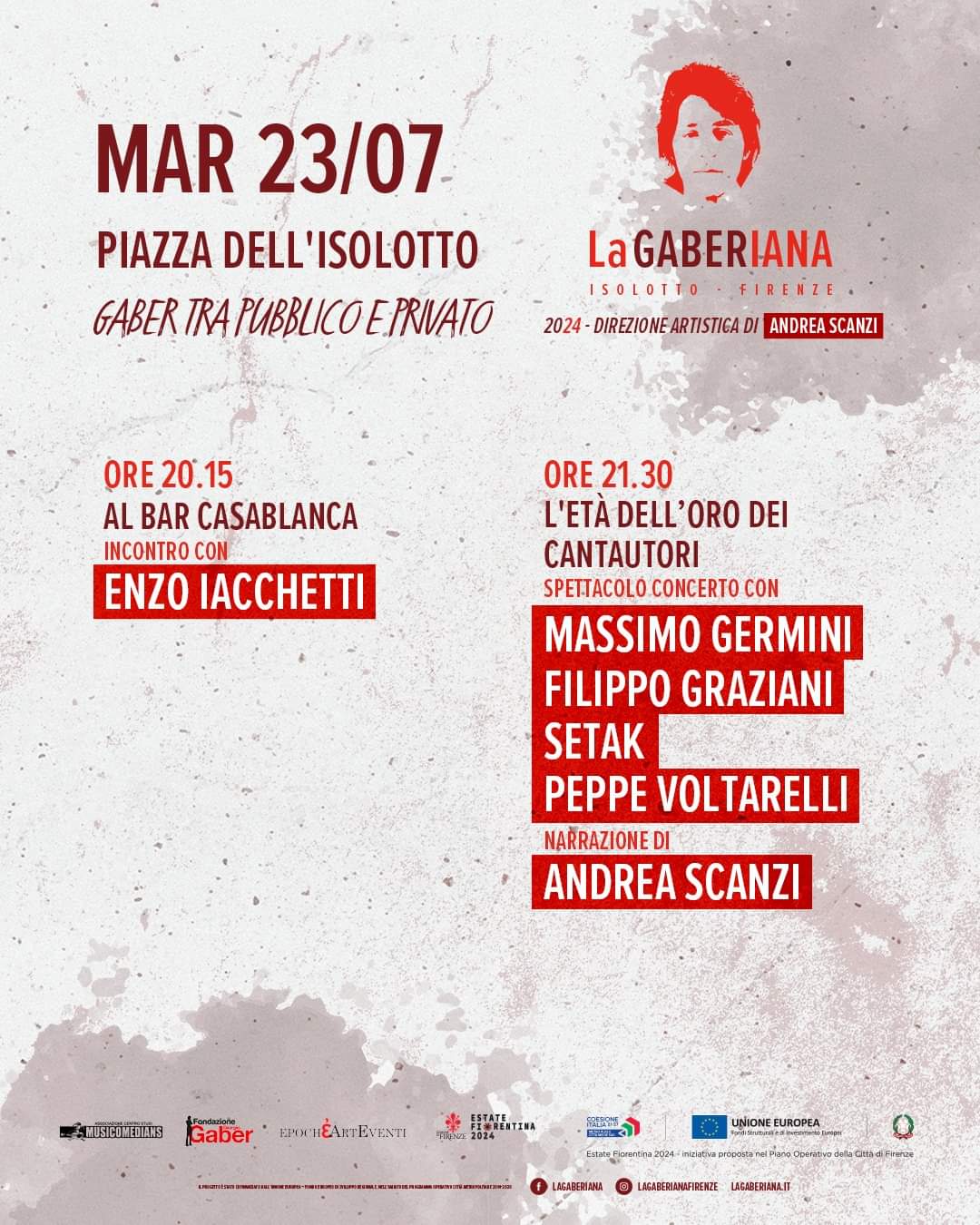 Inaugurata con grande successo lo scorso 15 luglio, La Gaberiana 2024 ha visto la partecipazione entusiasta della Sindaca e del Presidente del Quartiere 4. Questo evento culturale ha come obiettivo principale la celebrazione dell'opera e del pensiero del grande Giorgio Gaber, attraverso una serie di incontri e spettacoli che stanno animando il Quartiere 4.