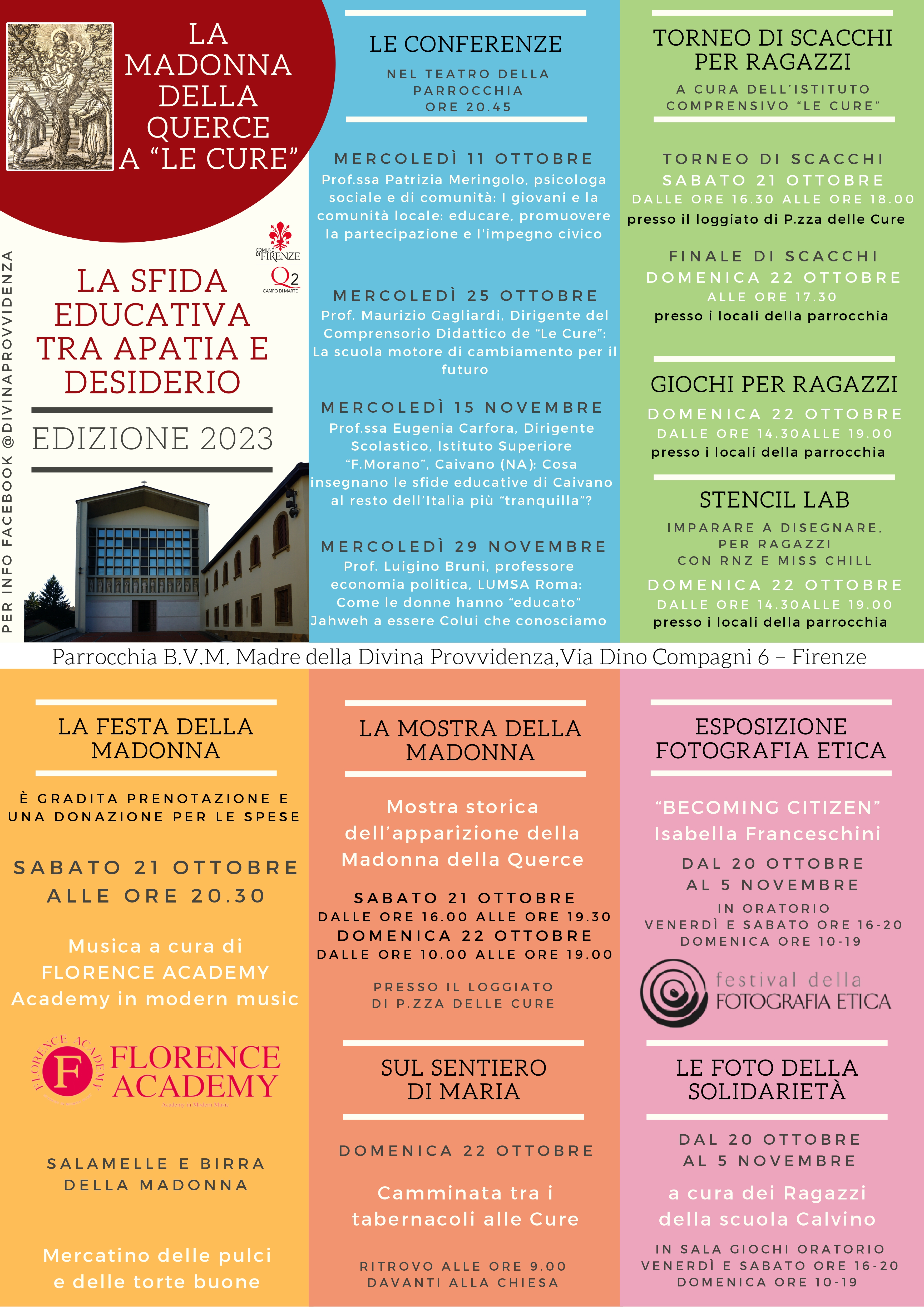 Ritorna per l'edizione 2023 il festival organizzato dalla Parrocchia B.M.V. Madre della Divina Provvidenza, con un programma ricco di incontri, conferenze, laboratori, giochi e mostre, incentrato sulle sfide educative e pedagogiche del nuovo millennio.