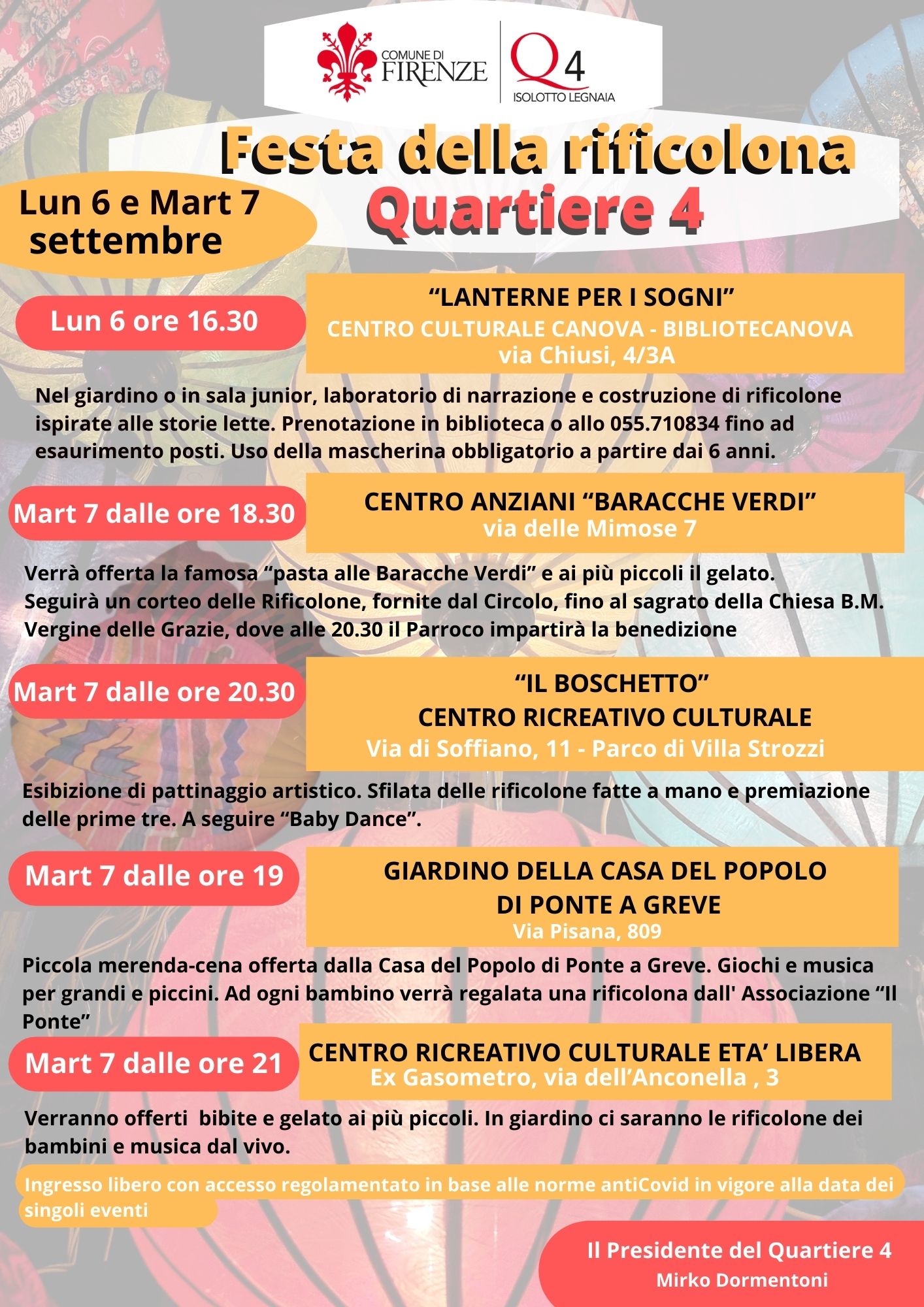 Martedì 7 settembre, dalle 20.30, al “Boschetto”, centro ricreativo culturale, via di Soffiano, 11 (Parco di Villa Strozzi) - esibizione di pattinaggio artistico, sfilata delle rificolone fatte a mano e premiazione delle prime tre, a seguire “Baby Dance”