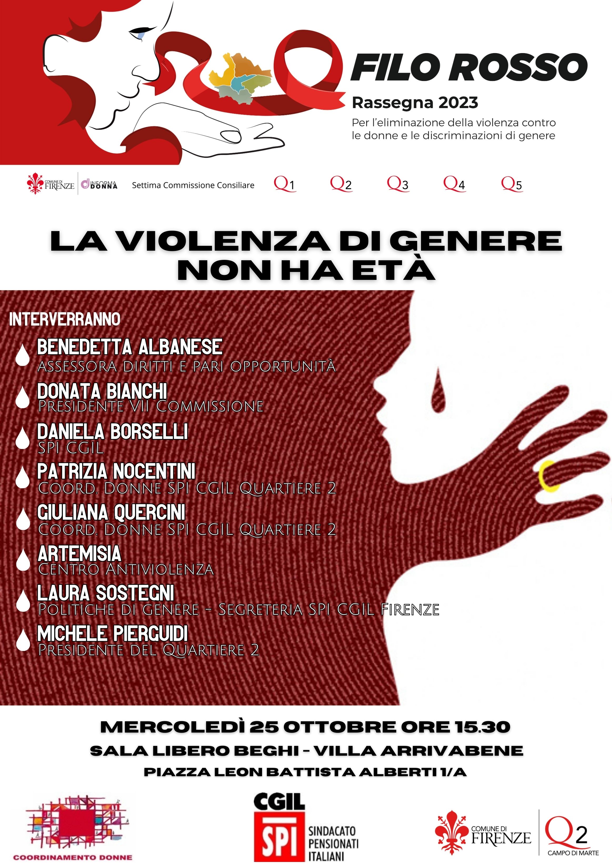 All'incontro interverranno l'Assessora ai diritti e alle pari opportunità Benedetta Albanese, la Presidente della VII Commissione Donata Bianchi, le coordinatrici della SPI CGIL Patrizia Nocentini, Giuliana Quercini, Daniela Borselli e Laura Sostegni, il centro antiviolenza Artemisia ed il Presidente del Quartiere 2 Michele Pierguidi.