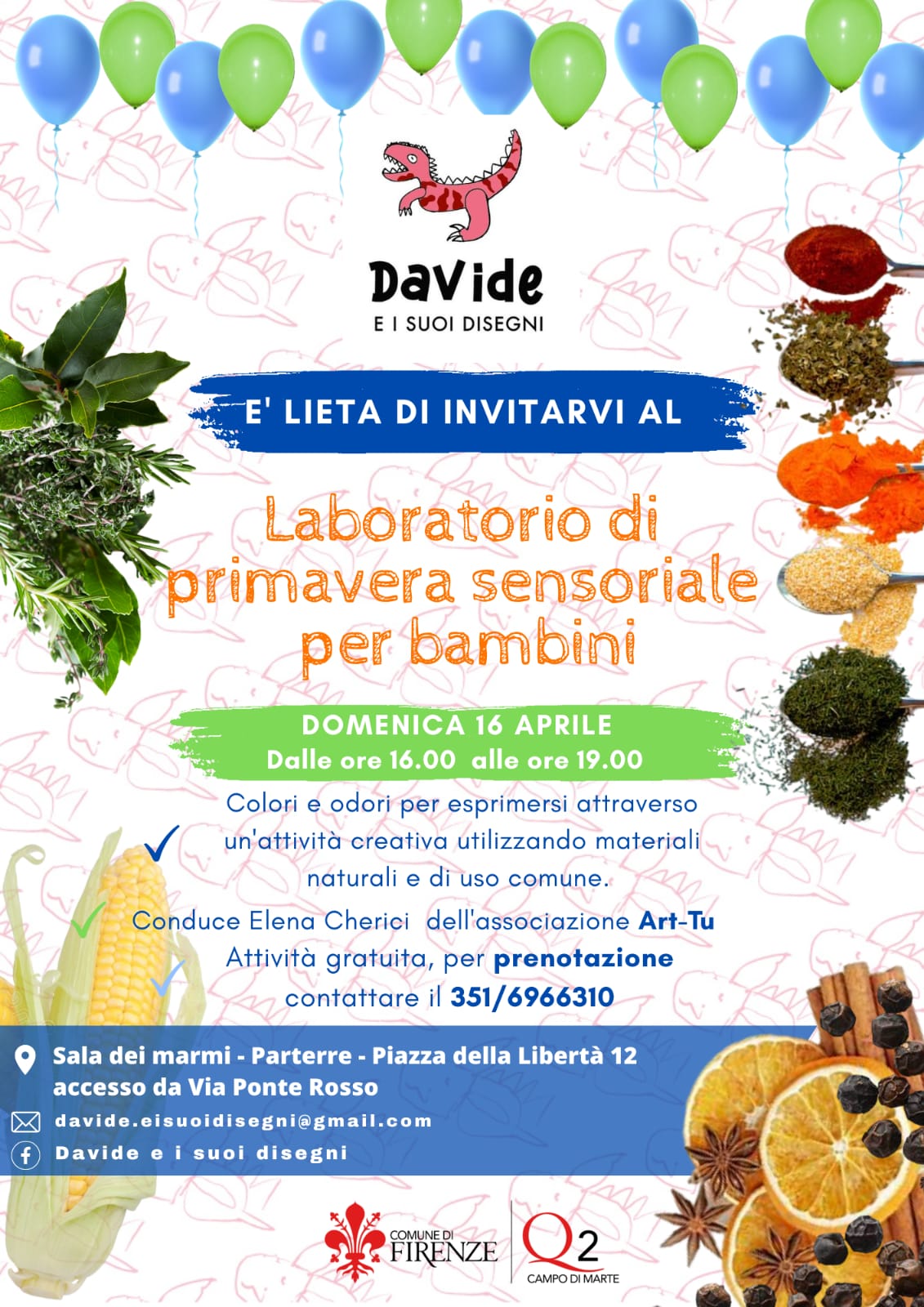 Domenica 16 Aprile dalle ore 16.00 alle ore 19.00, nella Sala dei Marmi al Parterre, si terrà il Laboratorio-evento di primavera sensoriale per i bambini, a cura dell'organizzazione "Davide e i suoi disegni" e con la conduzione di Elena Cherici; un'iniziativa dedicata ai più piccoli, nella quale potranno esprimere la loro creatività attraverso colori e odori con materiali naturali e di uso comune.