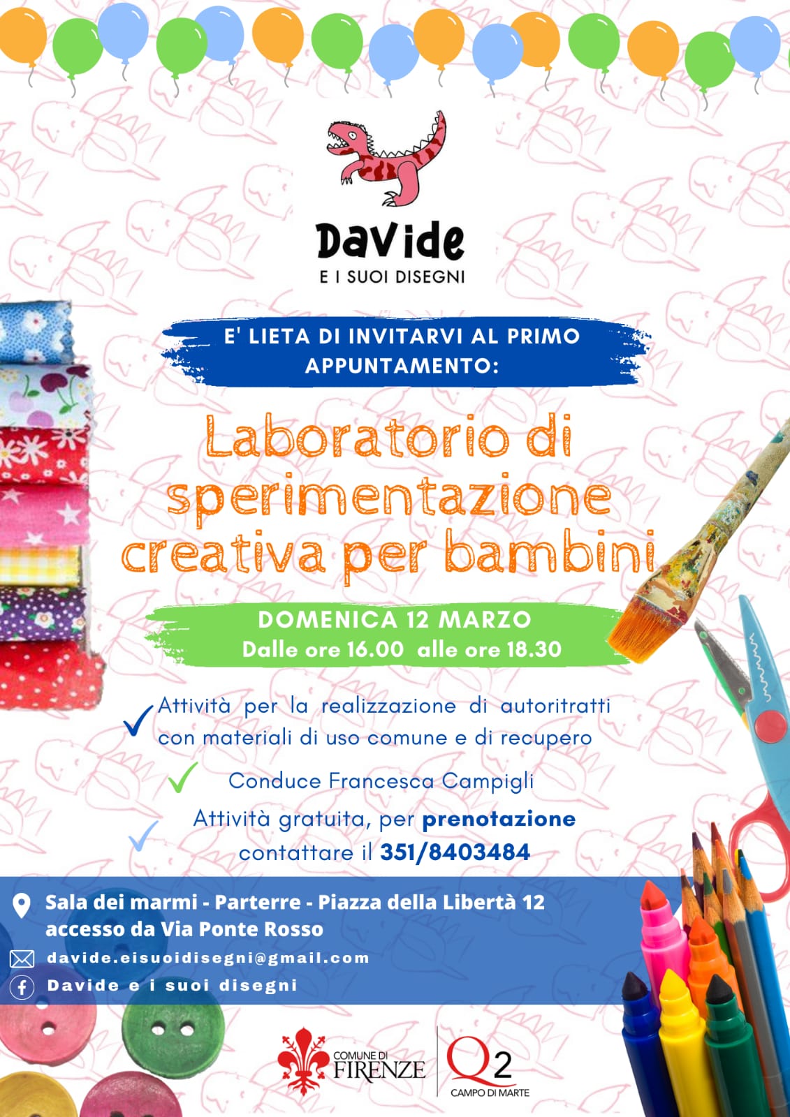Domenica 12 Marzo dalle ore 16.00 alle ore 18.30, nella Sala dei Marmi al Parterre, si terrà il Laboratorio-evento di sperimentazione creativa per i bambini, a cura dell'organizzazione "Davide e i suoi disegni" e con la conduzione di Francesca Campigli; un'iniziativa dedicata ai più piccoli, nella quale potranno esprimere la loro creatività realizzando autoritratti con materiali di uso comune e di recupero.