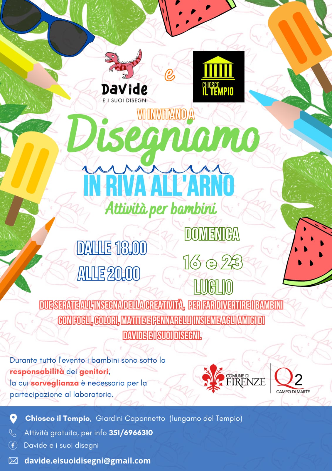 Domenica 16 e domenica 23 Luglio a partire dalle ore 18.00, presso il Chiosco il Tempio nei Giardini Caponnetto, si terrà il laboratorio per bambini "Disegniamo in riva all'Arno", a cura dell'Associazione Davide e i suoi disegni.