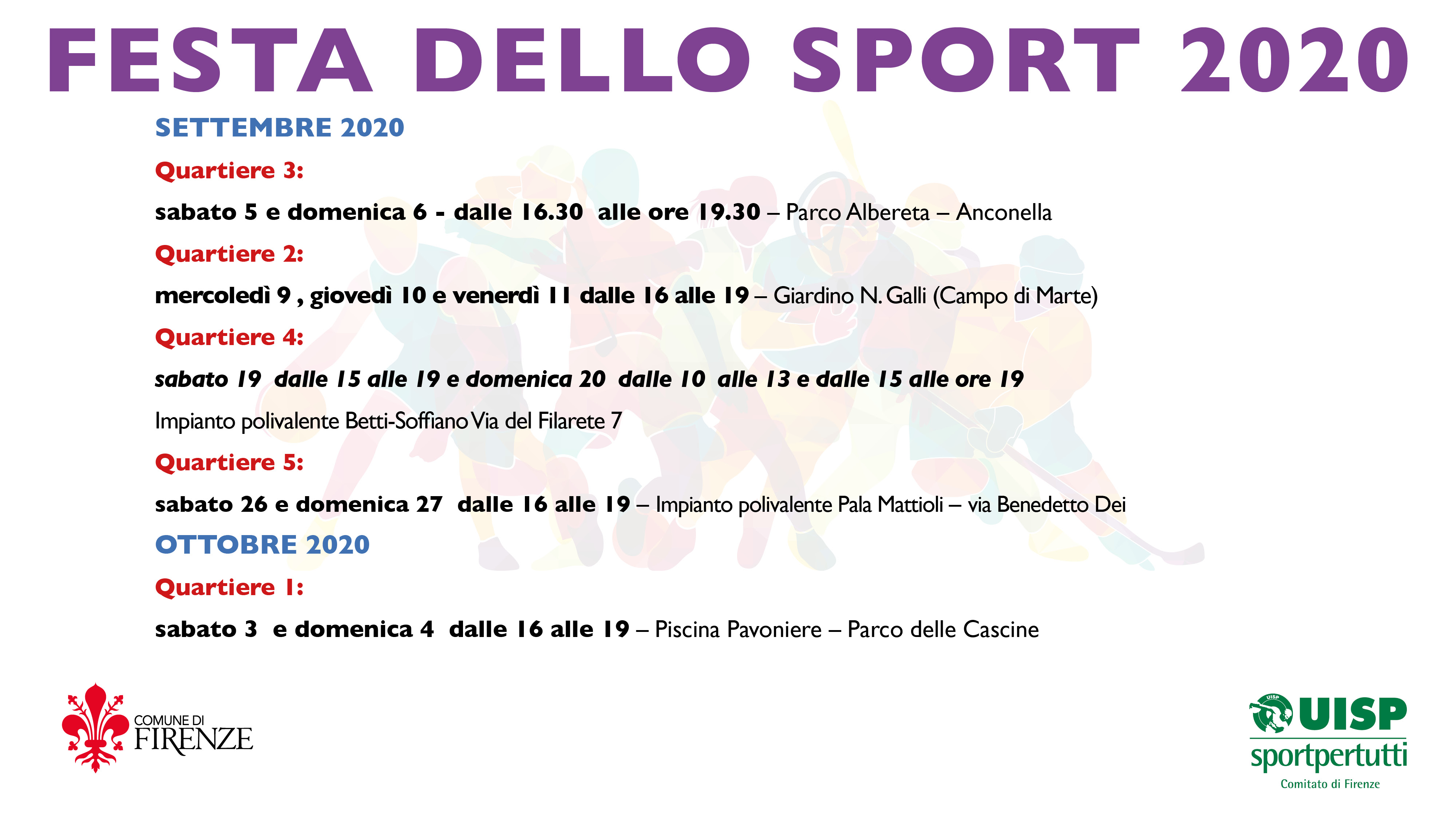 Sabato 19 (dalle 15 alle 19) e domenica 20 (dalle 10 alle 13 e dalle 15 alle 19) al Quartiere 4, impianto sportivo Betti in via del Filarete (zona Soffiano) con iniziative organizzate dalle società del territorio, intorno alla grande pista di atletica e dentro il palazzetto.
