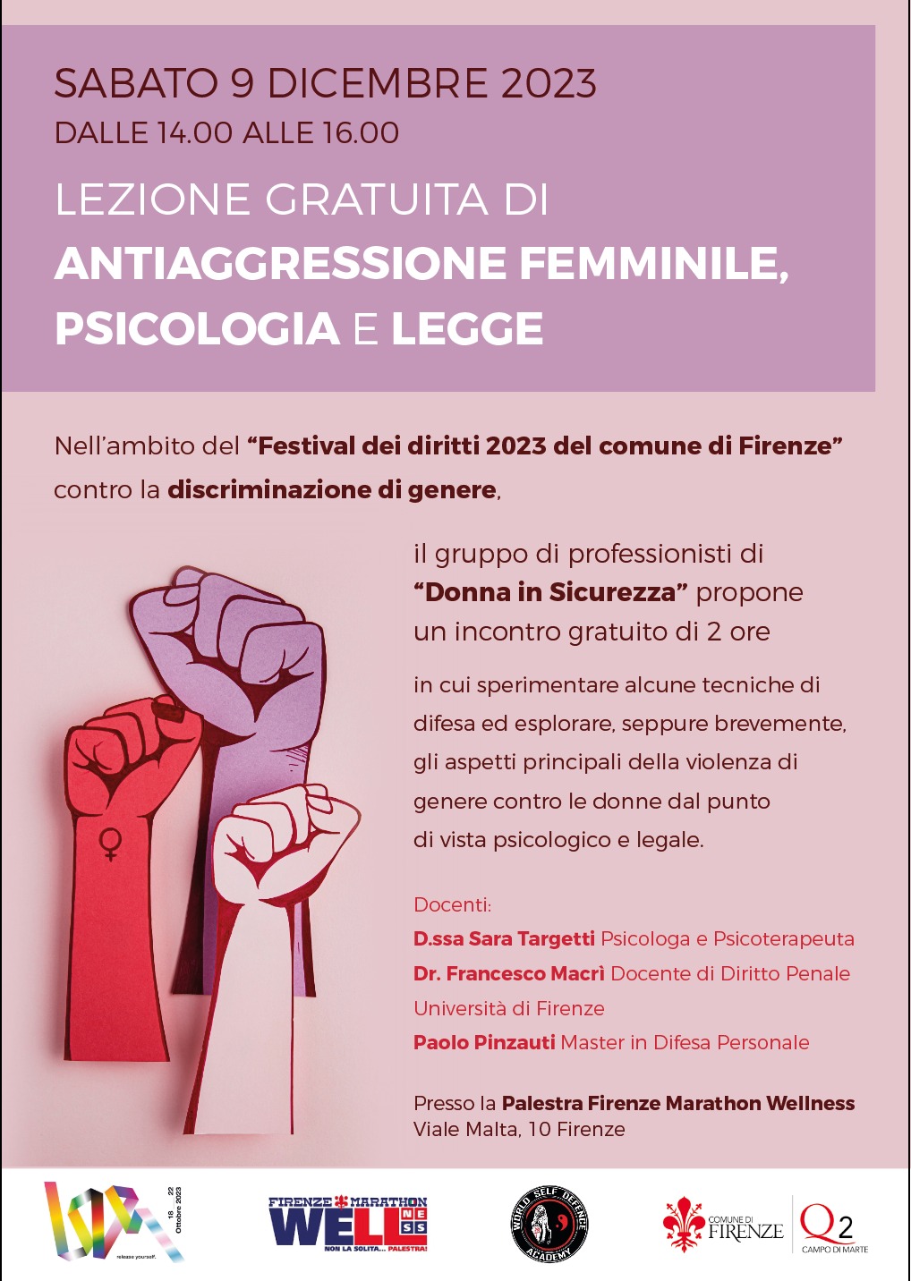 Sabato 9 dicembre, il gruppo di professionisti di "Donna in Sicurezza", nell'ambito del "Festival dei diritti 2023 del Comune di Firenze" contro la discriminazione di genere, propone un incontro gratuito di 2 ore in cui sperimentare alcune tecniche ed esplorare, seppure brevemente, gli aspetti principali della violenza di genere contro le donne dal punto di vista psicologico e legale.