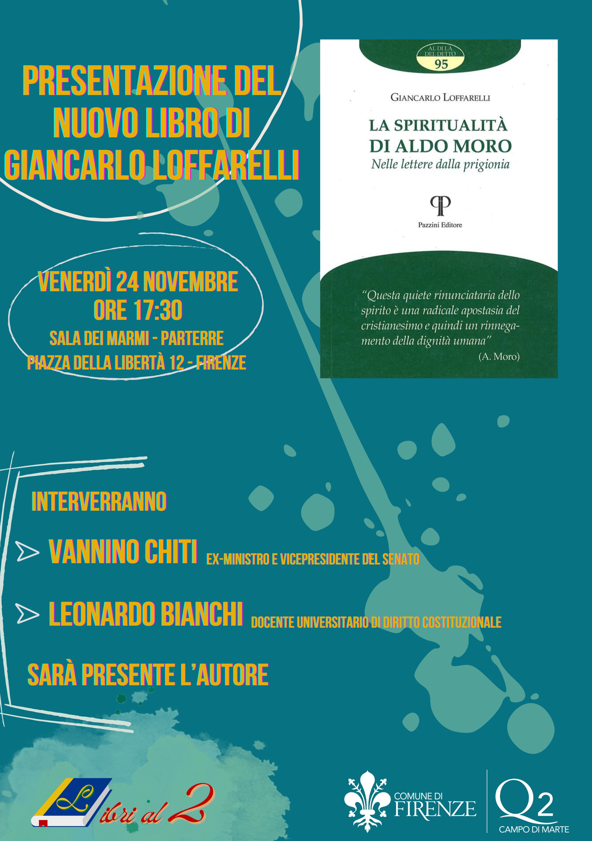 Venerdì 24 Novembre alle ore 17.30, presso la Sala dei Marmi al Parterre, si terrà la presentazione del Libro "La spiritualità di Aldo Moro", dall'autore Giancarlo Loffarelli; alla presentazione interverranno, con l'autore, Vannino Chiti, ex-ministro e vicepresidente del senato, e Leonardo Bianchi, docente universitario di diritto costituzionale.
