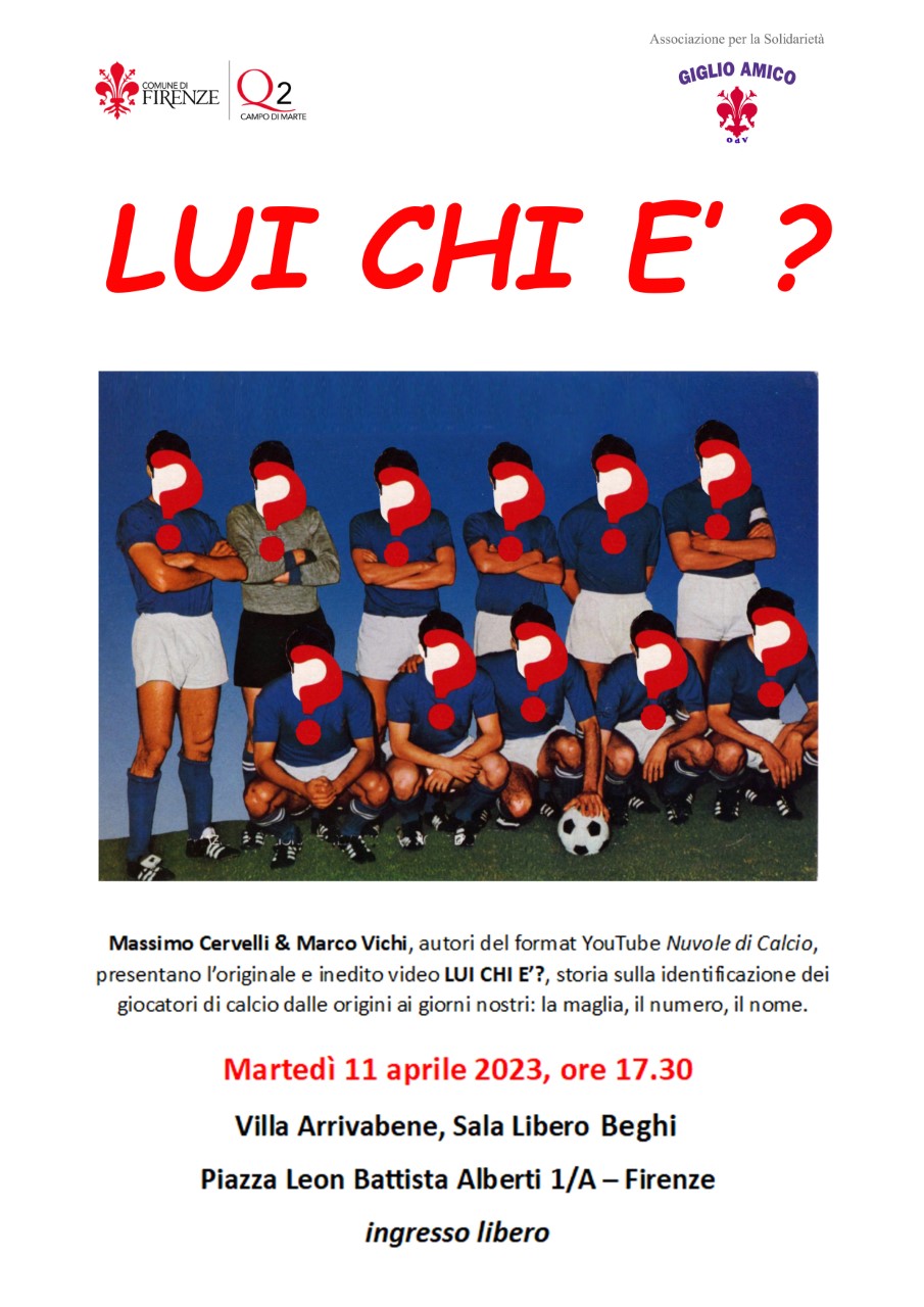 Martedì 11 Aprile alle ore 17.30, nella Sala Libero Beghi in Villa Arrivabene, si terrà l'evento dal titolo "Lui chi è", a cura di Massimo Cervelli e Marco Vichi con la collaborazione del Quartiere 2; una storia sulla identificazione dei giocatori di calcio dalle origini ai giorni nostri, attraverso le maglie, i numeri e i nomi dei calciatori.