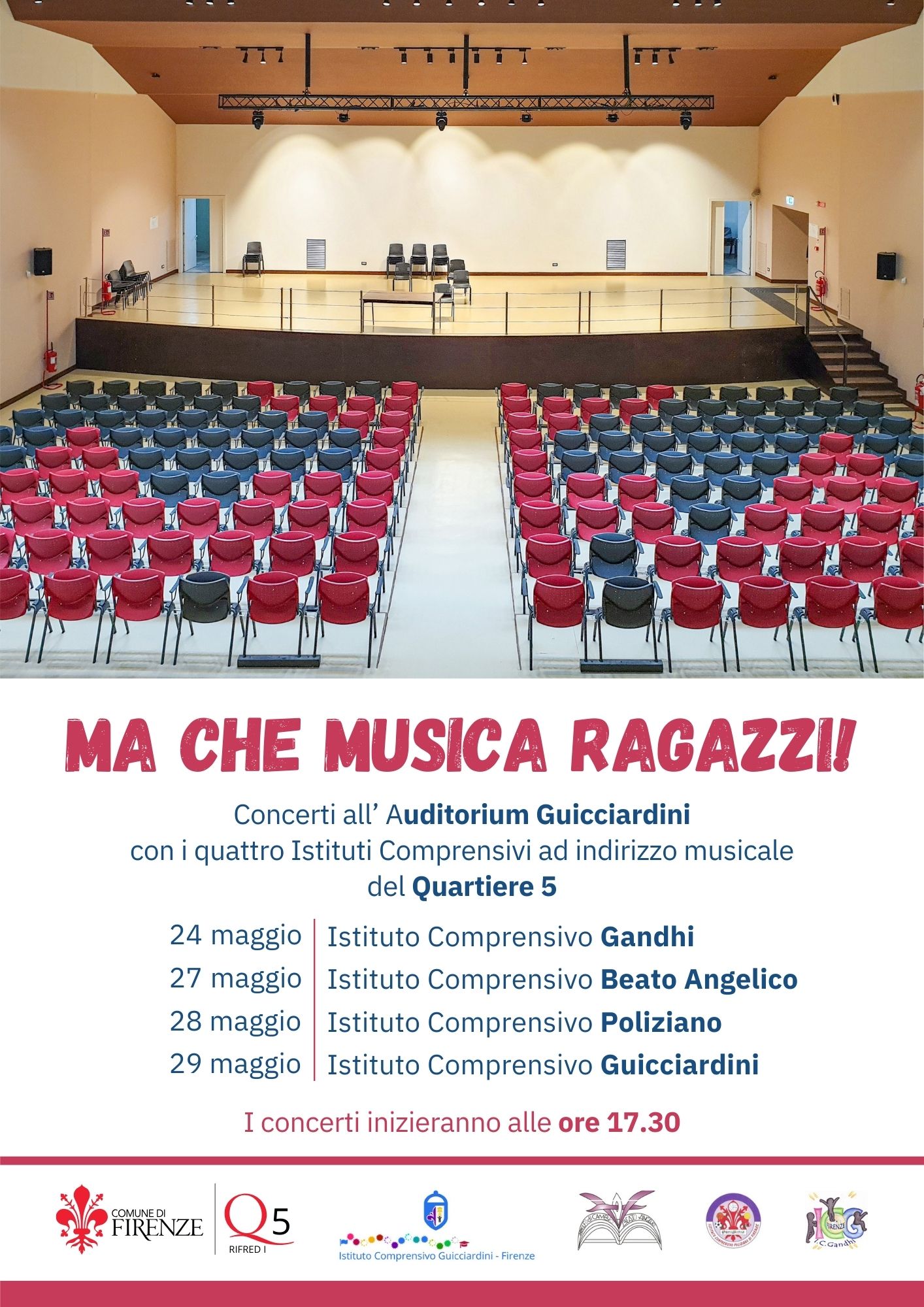 I quattro Istituti Comprensivi a indirizzo musicale del Quartiere 5, Beato Angelico, Gandhi, Guicciardini e Poliziano, presentano quattro concerti dei loro allievi all’Auditorium Guicciardini, in via Ramirez de Montalvo 1.