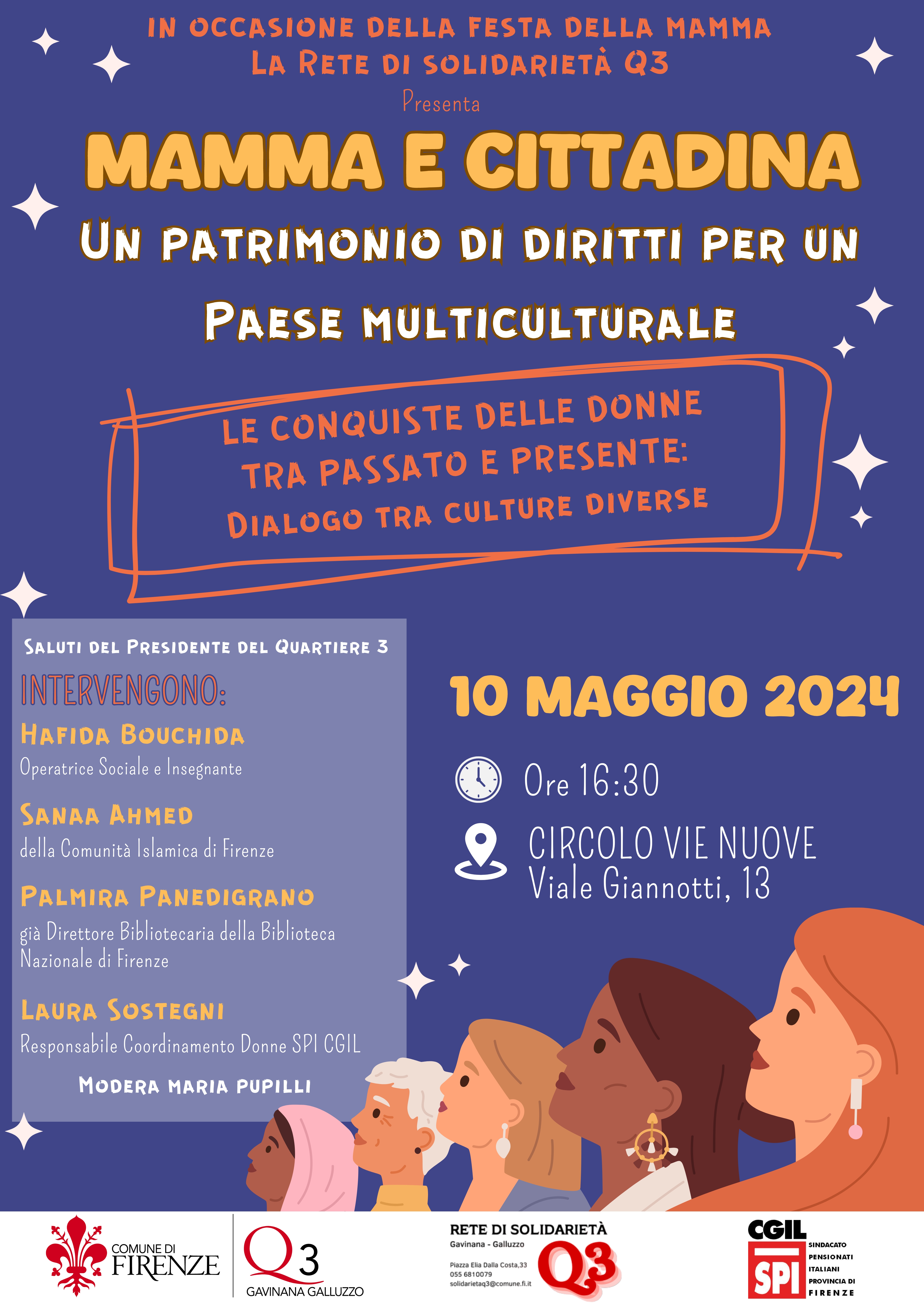 Venerdì 10 maggio alle ore 16:30 presso il Circolo Vie Nuove (viale D. Giannotti, 13) in occasione della festa della mamma, la Rete di Solidarietà del Quartiere 3 organizza un pomeriggio di discussione sulle conquiste delle donne e sul dialogo tra culture diverse.