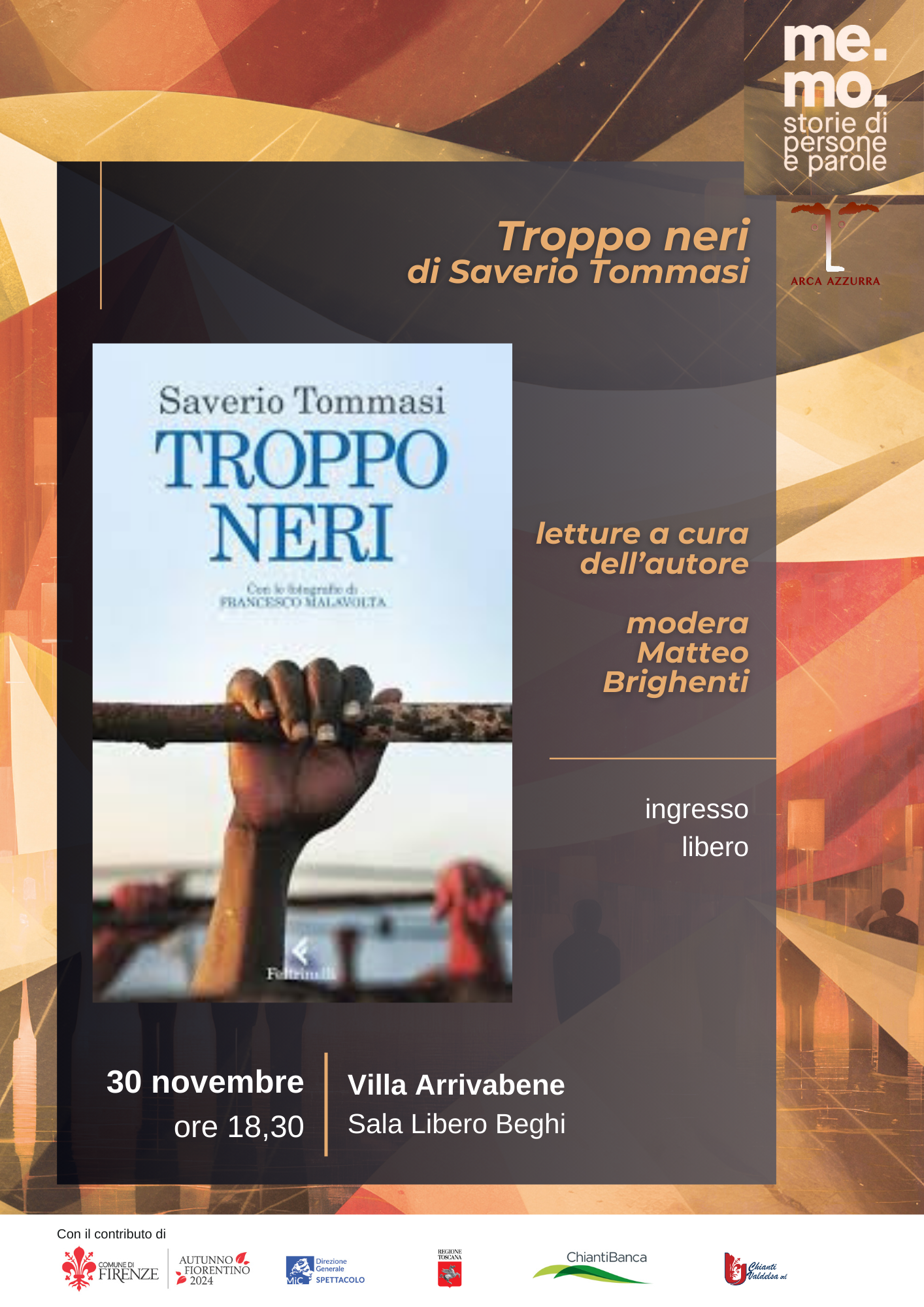 Prosegue anche nel Quartiere 2 la rassegna "MeMo-Storie di persone e parole", a cura di Arca Azzurra nell'ambito degli eventi dell'Autunno Fiorentino, con l'appuntamento del 30 Novembre alle ore 18.30 nella Sala Libero Beghi in Villa Arrivabene. L'evento, dal titolo "Troppo neri", sarà incentrato sul libro omonimo di Saverio Tommasi, con letture a cura dell'autore stesso e la presenza di Matteo Brighenti in qualità di moderatore.