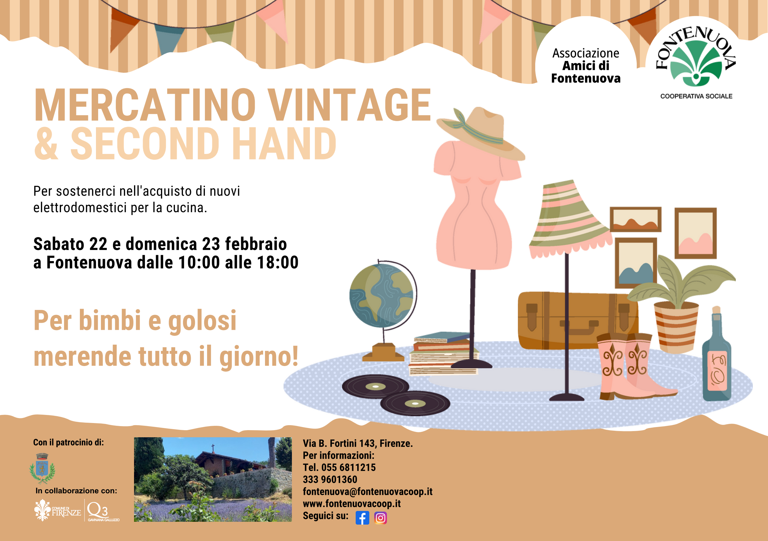 Sabato 22 e domenica 23 febbraio dalle ore 10:00 alle ore 18:00 si svolgerà presso la Cooperativa Fontenuova (via B. Fortini, 143 - Firenze) un mercatino del vintage e del second hand per sostenere la cooperativa nell'acquisto di nuovi elettrodomestici per la cucina.