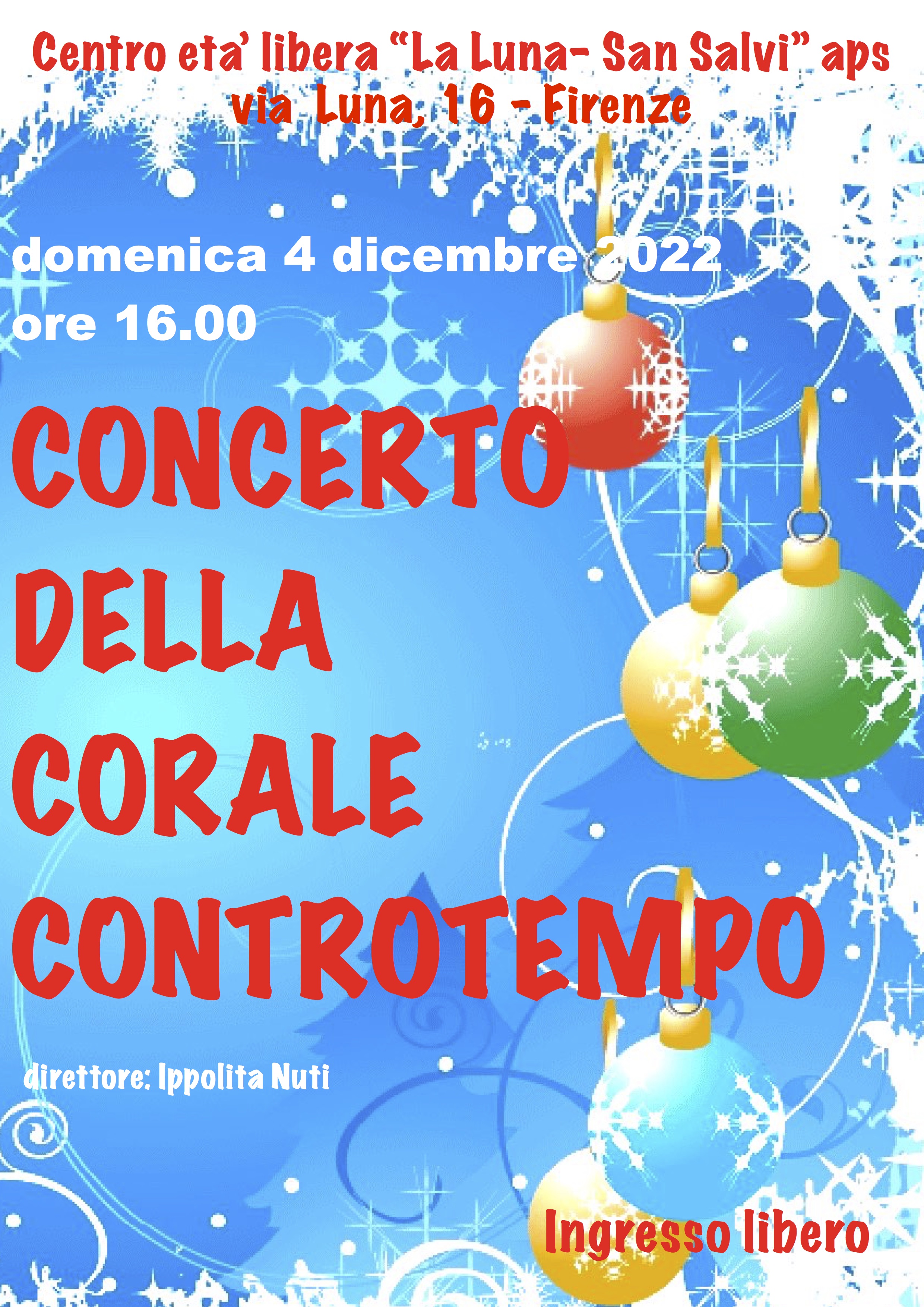 Torna il mercatino di Natale promosso dal Centro Età Libera "La Luna-San Salvi" in Via Luna n.16, dal 4 al 23 Dicembre tutti i pomeriggi dalle 15.30 alle 18.00, il giovedì ed il venerdì mattina anche dalle 10.00 alle 12.00. Domenica 4 Dicembre, alle ore 16.00, ci sarà inoltre il Concerto inaugurale ad ingresso libero della corale "Controtempo", diretto dal maestro Ippolita Nuti, a cui seguirà un piccolo rinfresco.