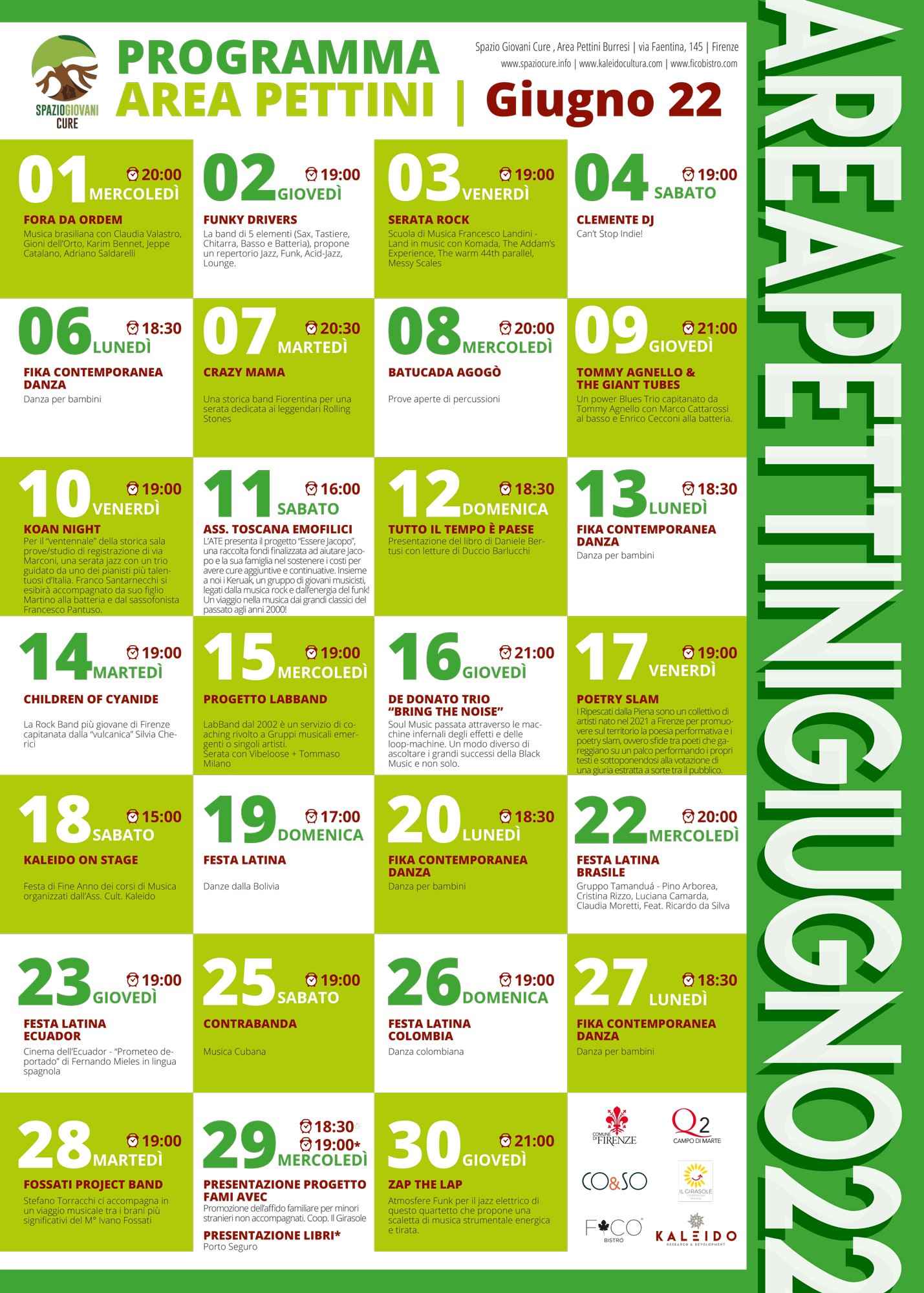 Il mese di giugno vedrà protagonista principale la musica, ma anche nuove manifestazioni come il poetry slam si affacciano all'area Pettini grazie al collettivo I Ripescati dalla Piena. Non mancheranno le presentazioni letterarie con Porto Seguro Editore e alla fine del mese la grande Festa Latina con danze sudamericane, musica e cinema di Bolivia, Colombia, Ecuador, Brasile e Cuba.