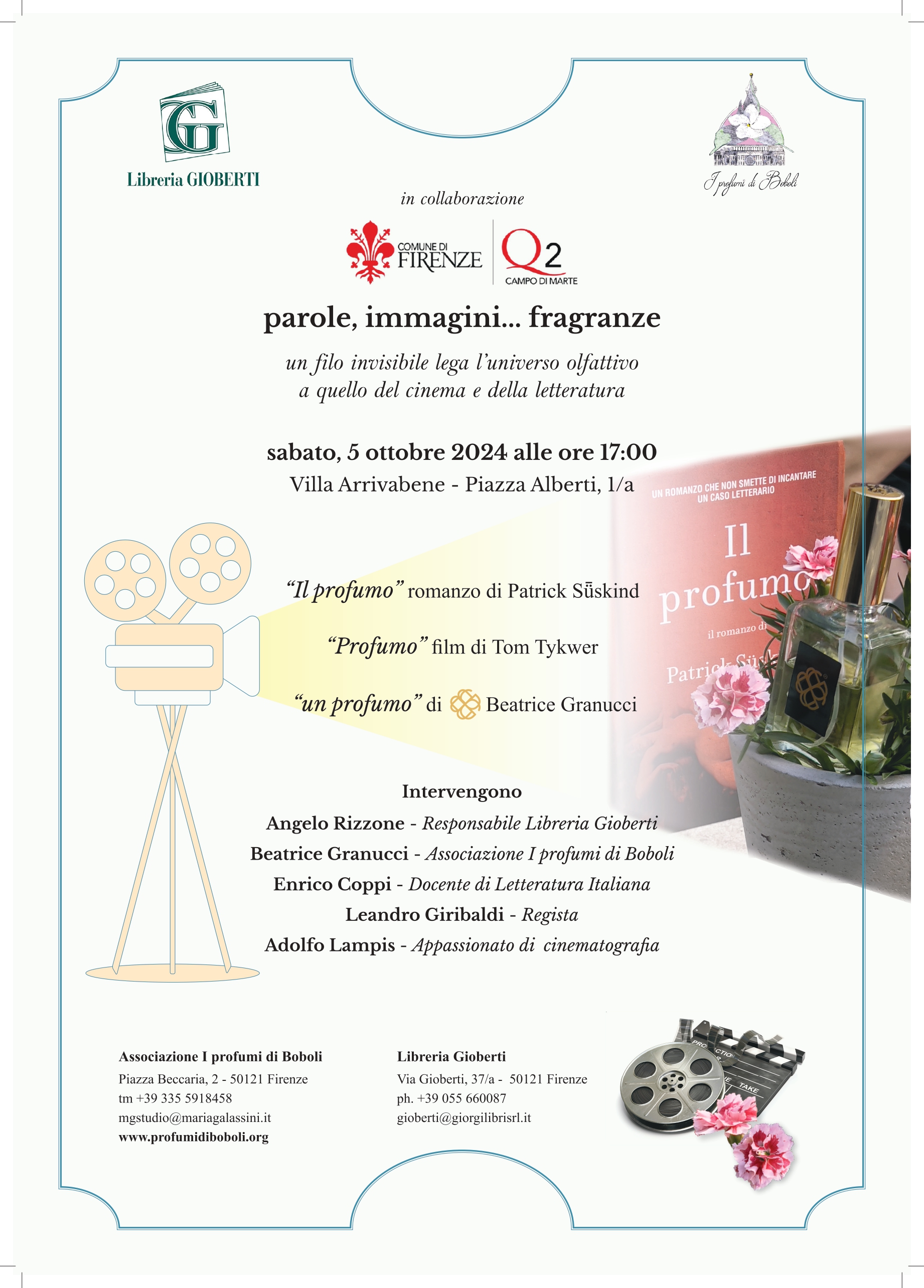 Sabato 5 Ottobre 2024 alle ore 17.00, nella Sala Consiliare di Villa Arrivabene, si terrà l'evento "Parole, immagini... fragranze", a cura della Libreria Gioberti in collaborazione con l'associazione "I profumi di Boboli"; un viaggio alla scoperta del filo invisibile che lega l'olfatto al mondo del cinema e della letteratura.