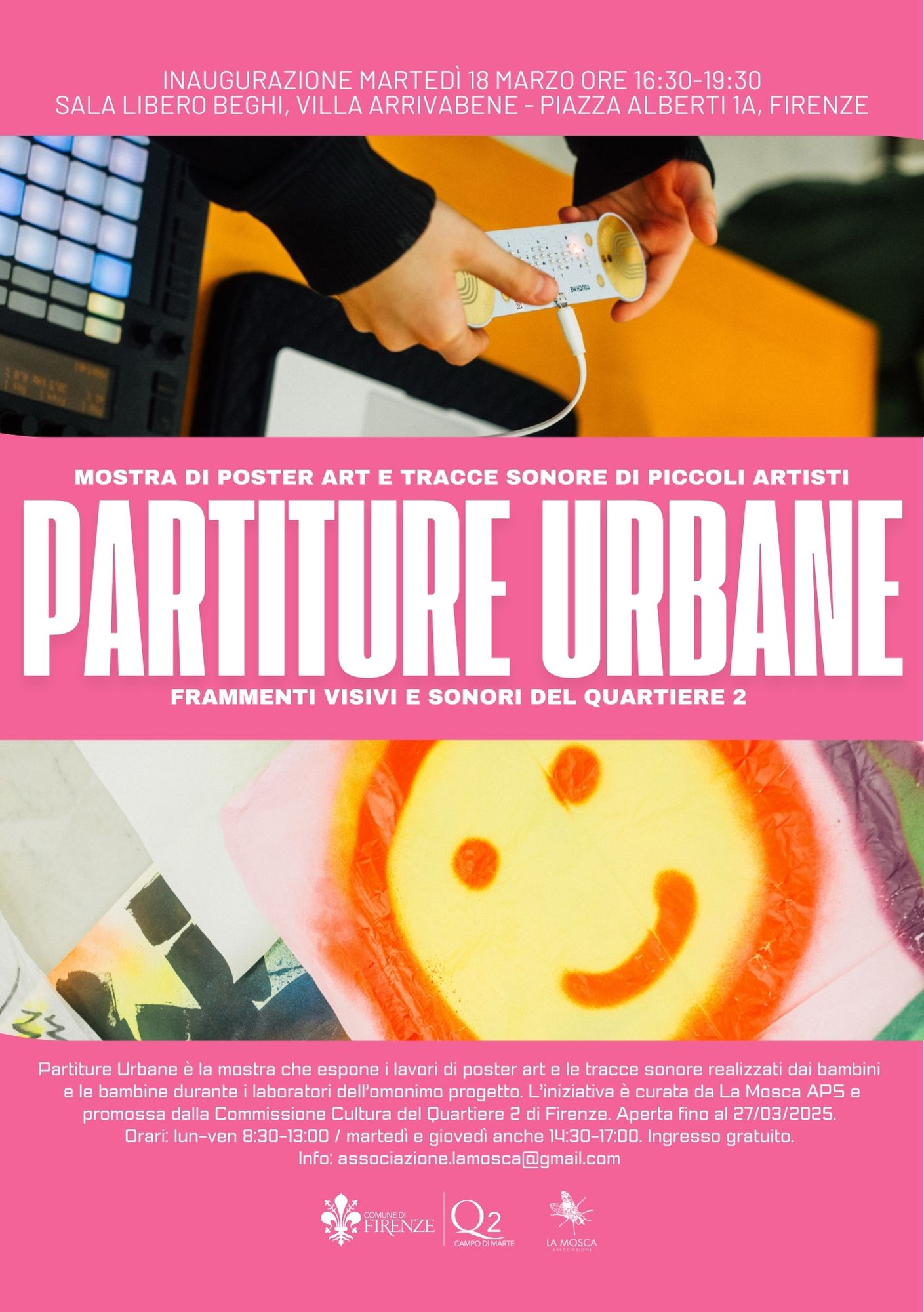 Partiture Urbane è la mostra che espone i lavori di poster art e le tracce sonore realizzate dai bambini e le bambine durante i laboratori creati nella rassegna natalizia di eventi dall'APS La Mosca, con la collaborazione del Quartiere 2; un'esposizione che raccoglie frammenti visivi e sonori del nostro Quartiere, catturati dai bambini che hanno partecipato all'omonimo progetto.