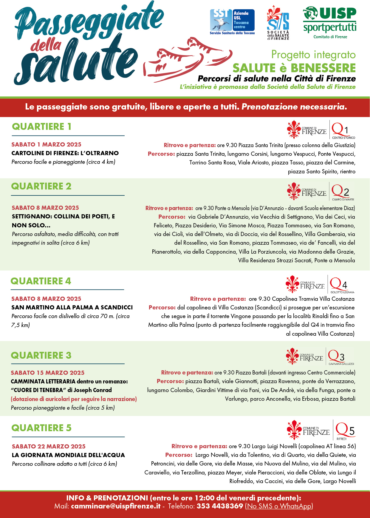 Proseguono a marzo 2025 le passeggiate gratuite organizzate dalla UISP Firenze nei Quartieri Fiorentini, con cinque nuovi appuntamenti nei sabati del mese; per partecipare è obbligatoria la prenotazione, da effettuare telefonicamente al numero 055 6583561 (entro le ore 12 del venerdì precedente) o tramite mail all'indirizzo camminare@uispfirenze.it.