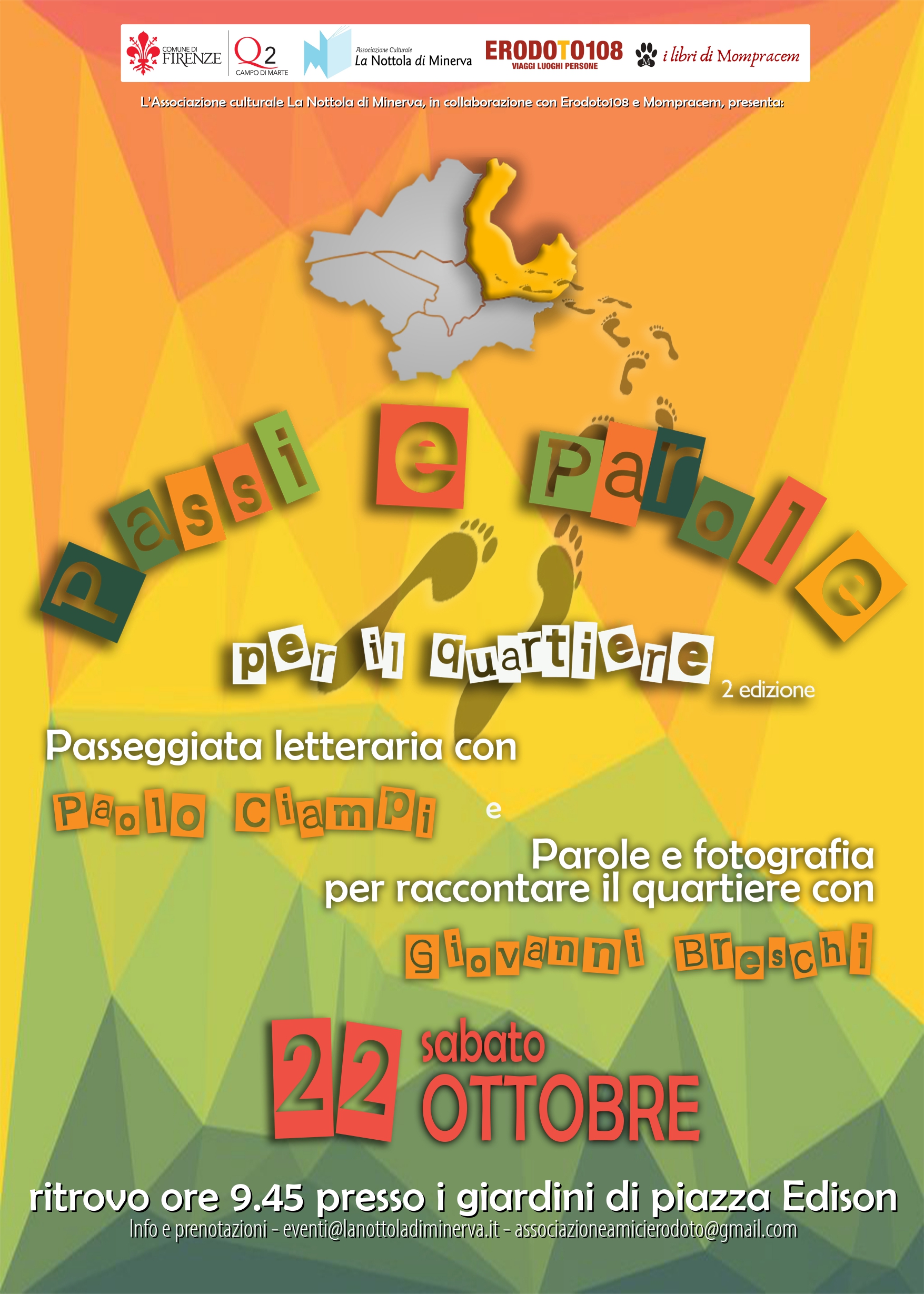Sabato 22 Ottobre torna con la seconda edizione l'iniziativa, promossa dall'associazione La Nottola di Minerva, "Passi e parole per il Quartiere", in compagnia dello scrittore e giornalista Paolo Ciampi; una passeggiata letteraria dedicata alla valorizzazione degli scrittori e dei luoghi particolarmente significativi del Quartiere 2. Un omaggio alla grande letteratura e al paesaggio: da Gabriele D’Annunzio a Giovanni Boccaccio, da Aldo Palazzeschi a Wu Ming per finire con Bruno Cicognani e Luigi Nacci.