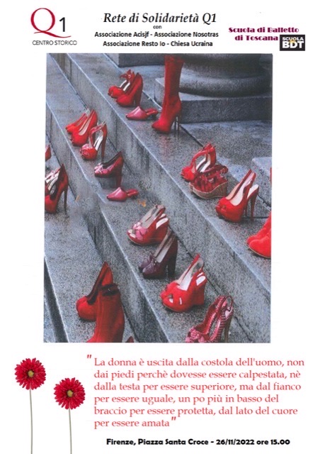 Un evento contro ogni violenza nei confronti della donna e a favore della solidarietà, a cura della Rete di Solidarietà del Quartiere 1, unitamente alle seguenti Associazioni: Scuola Balletto di Toscana, Associazione Nosotras, Associazione Acisjf, Associazione Resto io, Chiesa Ucraina. Inizio ore 15.