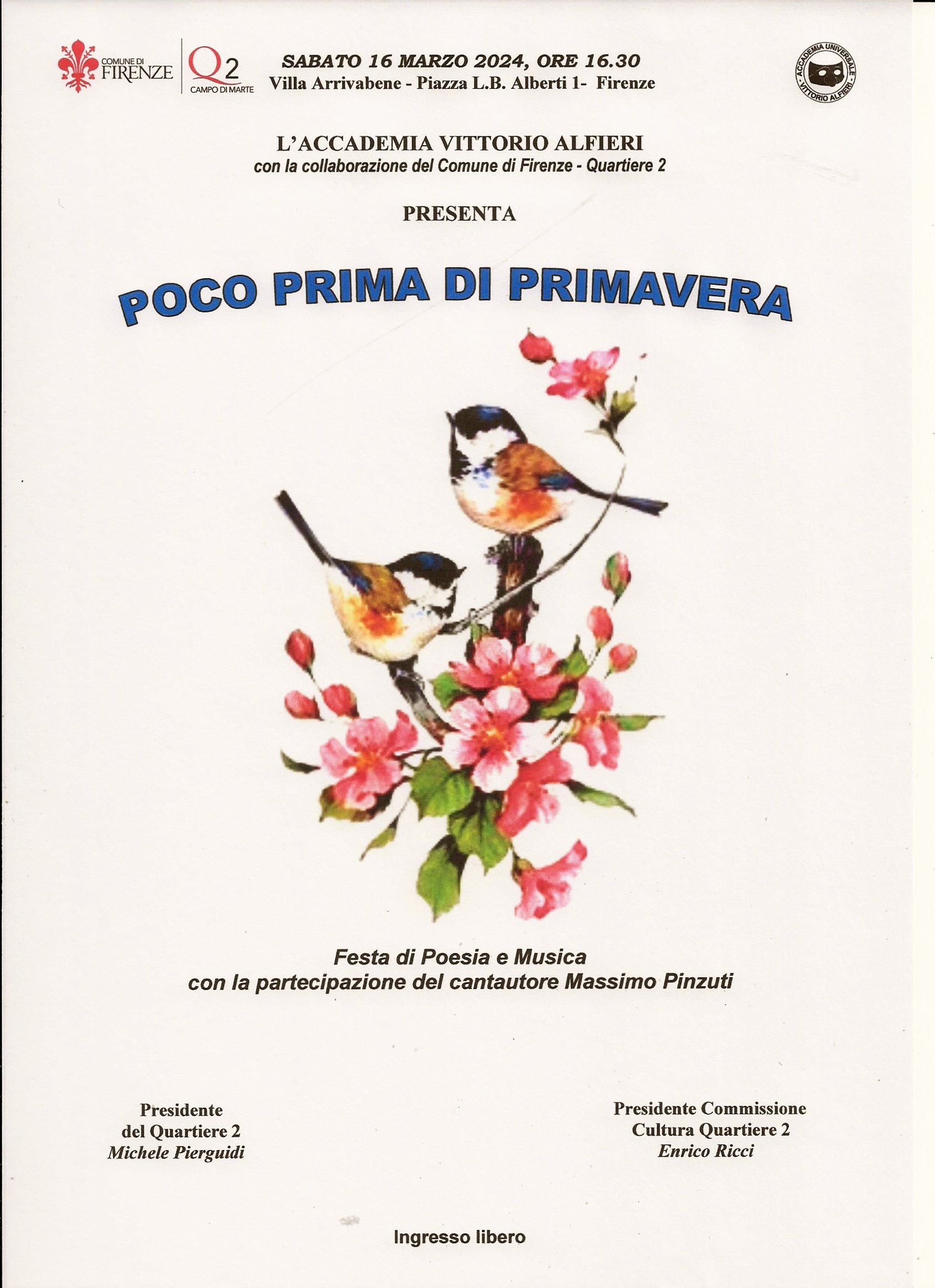 Sabato 16 Marzo alle ore 16.30, nella Sala Libero Beghi in Villa Arrivabene, si terrà l'evento "Poco prima di primavera", a cura dell'Accademia Alfieri con la collaborazione del Quartiere 2; una festa di poesia e musica con i poeti dell'Accademia e con la partecipazione del cantautore Massimo Pinzuti.