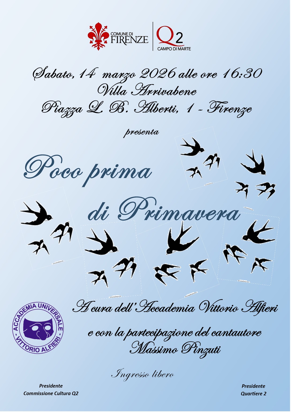 Sabato 14 Marzo alle ore 16.30, nella Sala Libero Beghi in Villa Arrivabene, si terrà l'evento "Poco prima di Primavera", a cura dell'Accademia Alfieri con la collaborazione del Quartiere 2 e la partecipazione del cantautore Massimo Pinzuti.