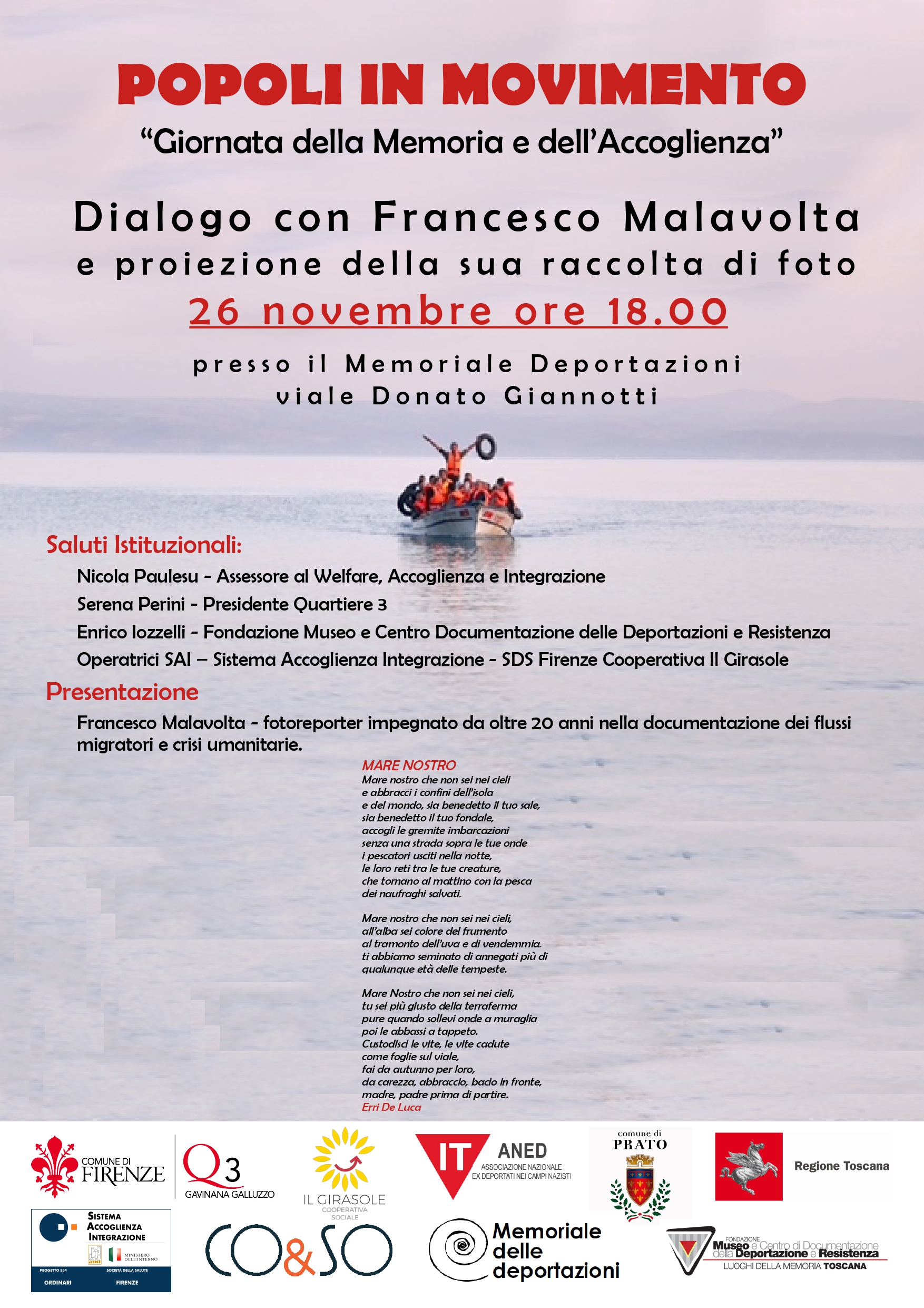 Martedì 26 novembre alle ore 18:00 presso il Memoriale delle Deportazioni in viale Donato Giannotti il Quartiere 3 ha organizzato un dialogo con proiezione della mostra fotografica di Francesco Malavolta - fotoreporter impegnato da oltre 20 anni nella documentazione dei flussi migratori e crisi umanitarie.