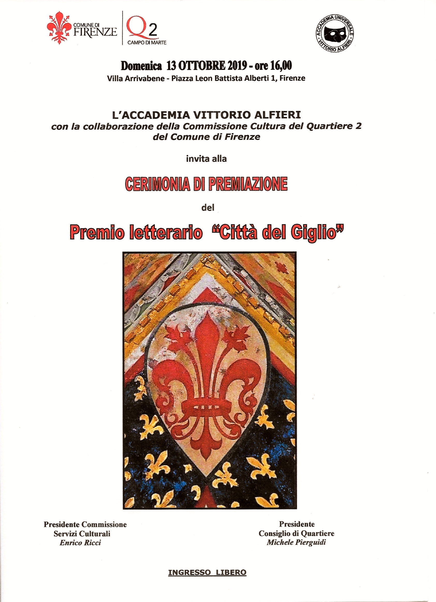 L'Accademia Vittorio Alfieri, con la collaborazione della Commissione Cultura del Q2 del Comune di Firenze, invita la cittadinanza a Villa Arrivabene (Piazza Alberti 1/a) per la cerimonia di premiazione del Premio letterario "Città del Giglio".