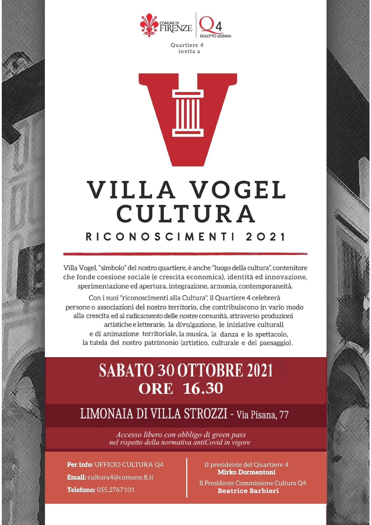 Settima edizione per il “Premio Villa Vogel Cultura 2021”. Si tratta di un insieme di riconoscimenti istituiti dal Consiglio di Quartiere 4 che intendono premiare personalità e associazioni operanti nel campo culturale, inteso nel senso più ampio possibile, comprensivo dei suoi risvolti sociali, educativi e civici.
