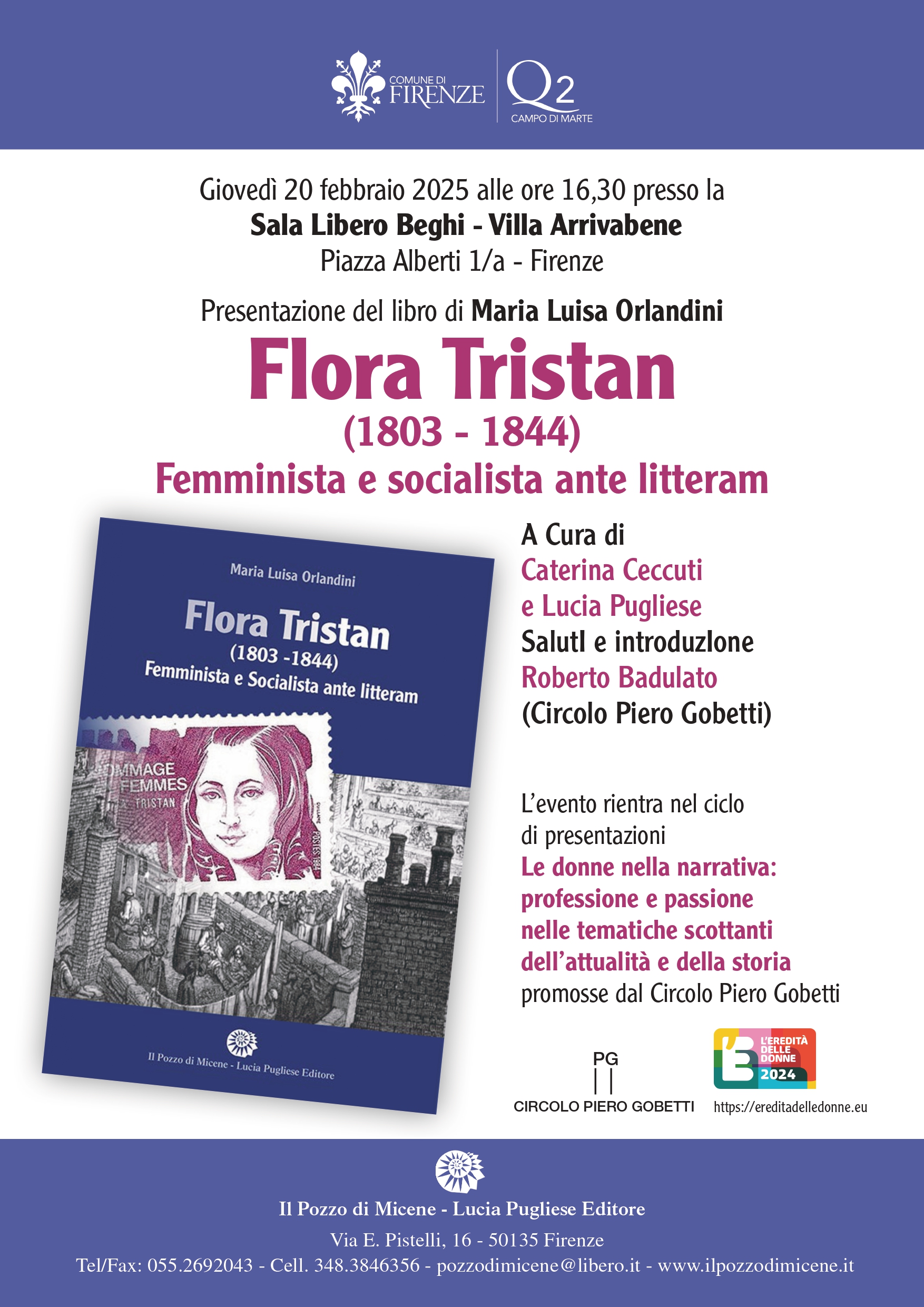 Giovedì 20 Febbraio alle ore 16.30, nella Sala Libero Beghi in Villa Arrivabene, si terrà la presentazione del libro di Maria Luisa Orlandini "Flora Tristan - Femminista e socialista ante litteram", a cura di Caterina Ceccuti e Lucia Pugliese con l'introduzione di Roberto Badulato del Circolo Culturale Piero Gobetti.
