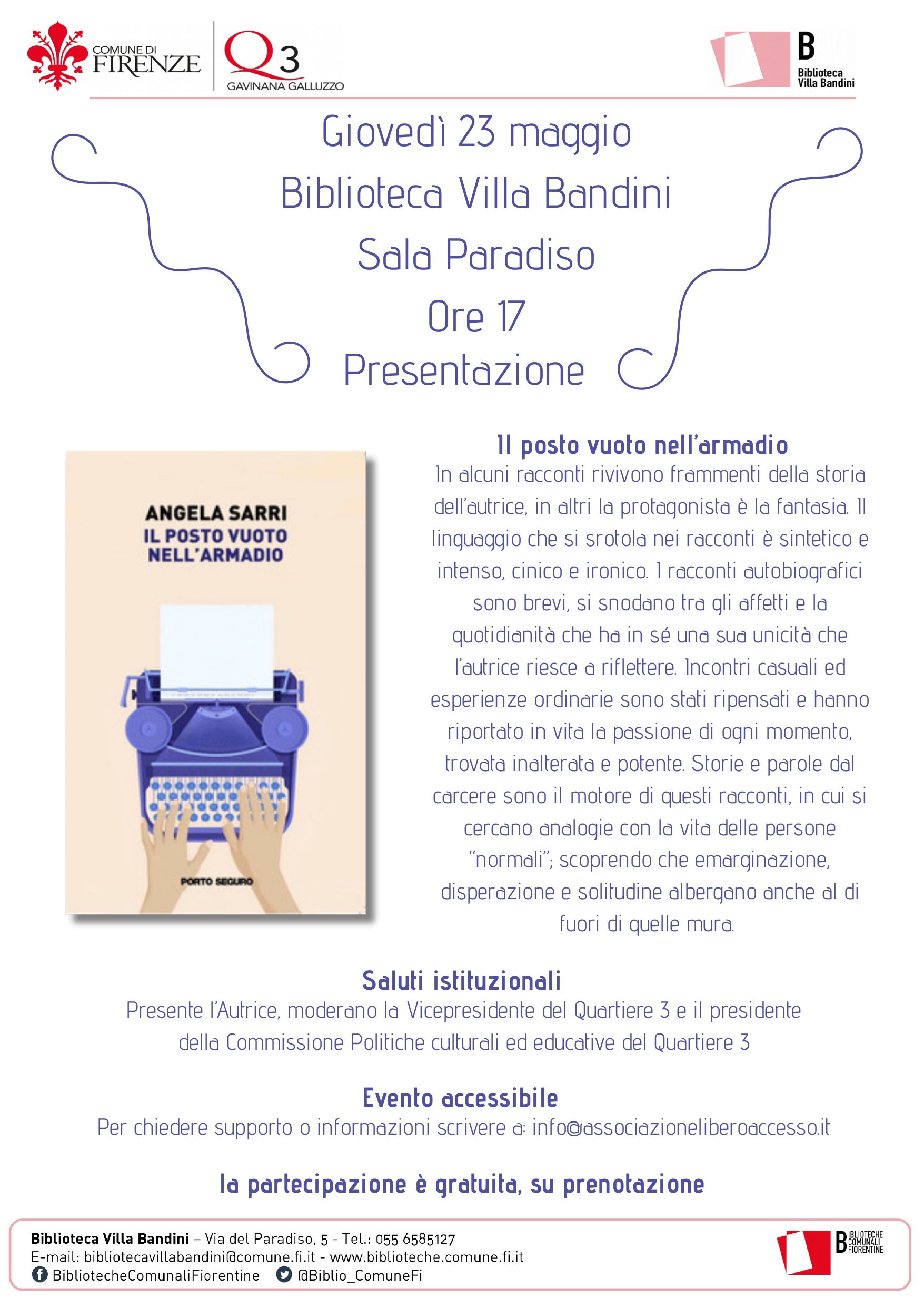 Giovedì 23/05/2024 alle ore 17:00 presso la biblioteca Villa Bandini (via del Paradiso, 5) si terrà la presentazione del libro di Angela Sarri dal titolo "Il posto vuoto nell'armadio".
