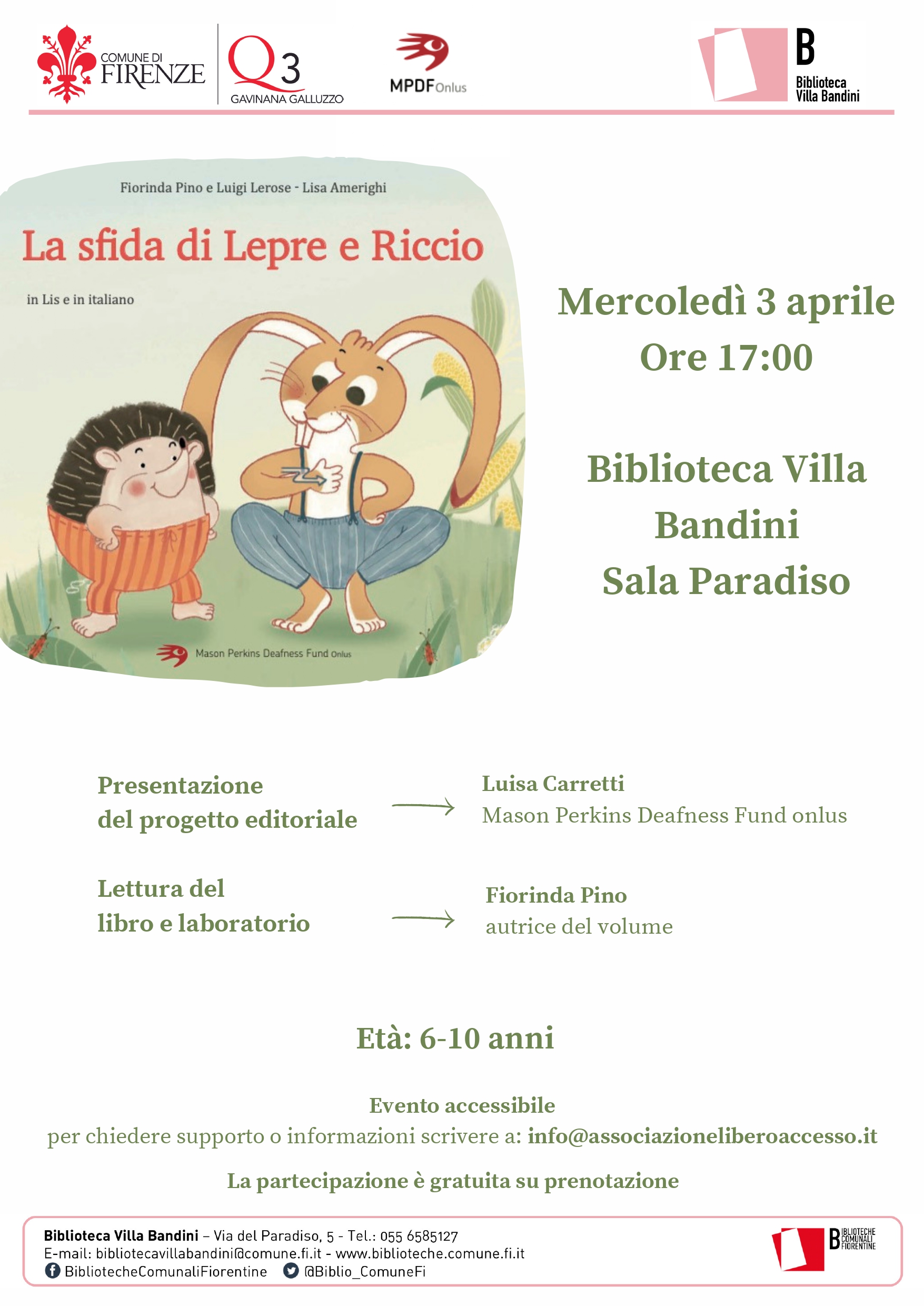 Mercoledì 3 aprile alle ore 17:00 presso la biblioteca Villa Bandini si terrà la presentazione del libro per bambini "La sfida di Lepre e Riccio", un libro illustrato per bambini bilingue in Lis e in italiano.