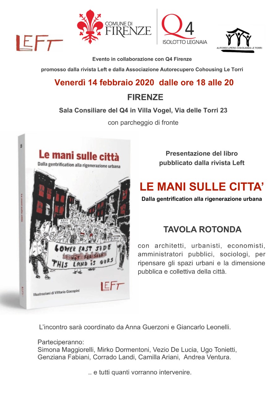 Venerdì 14 febbraio dalle 18 alle 20 Villa Vogel Sala Consiliare Tosca Bucarelli, via delle Torri 23, si terrà la presentazione del libro “Le mani sulle città. Dalla dalla gentrification alla Rigenerazione Urbana” a cura dell’Associazione Autorecupero Cohousing Le Torri.