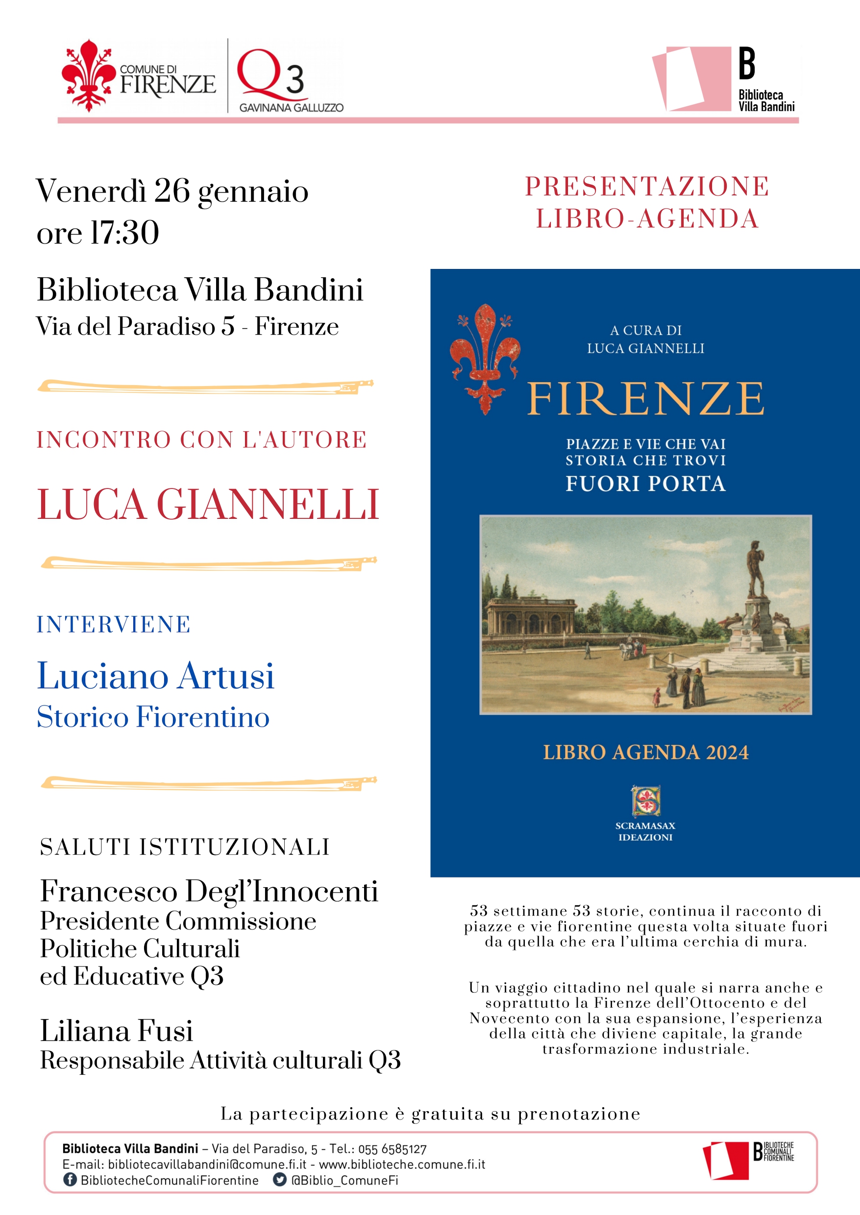 Venerdì 26 gennaio alle ore 17:30 presso la sala Paradiso della biblioteca Villa Bandini, si terrà la presentazione del Libro Agenda 2024 dal titolo "Firenze - Piazze e vie che vai storia che trovi fuori porta": 53 settimane e 53 storie dove si raccontano le piazze e le vie fiorentine situate fuori da quella che era l'ultima cerchia di mura. Un viaggio cittadino nel quale si narra anche e soprattutto la Firenze dell'Ottocento e del Novecento con la sua espansione, l'esperienza della città che diviene capitale e la grande trasformazione industriale.