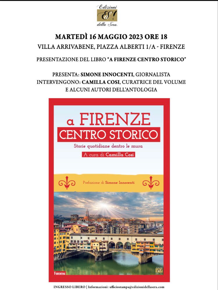 Martedì 16 Maggio alle ore 18, nella Sala Libero Beghi in Villa Arrivabene, verrà presentato il nuovo libro a cura di Camilla Cosi "A Firenze Centro Storico"; un viaggio nel cuore del territorio fiorentino attraverso una raccolta di racconti di numerosi autori cittadini. Alla presentazione, introdotta da Simone Innocenti, interverranno Camilla Cosi ed alcuni degli autori dei racconti che compongono il libro.
