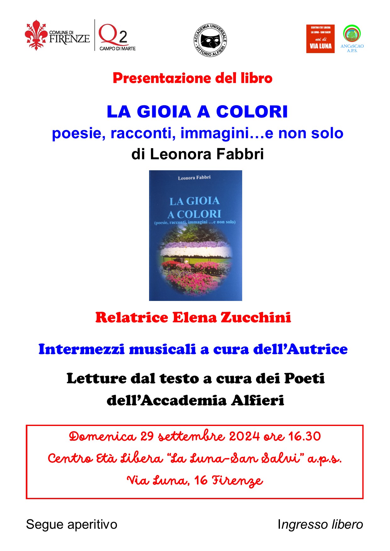 Domenica 29 Settembre alle ore 16.30, presso il Cento Età Libera La Luna-San Salvi, si terrà la presentazione del libro "La gioia a colori - poesie, racconti. immagini...e non solo", capitolo conclusivo della trilogia della Gioia dall'autrice Leonora Fabbri, con la presenza di Elena Zucchini, coordinatrice della Sezione Ligure dell'Accademia Vittorio Alfieri, in qualità di relatrice e con letture dal testo dei Poeti dell'Accademia.